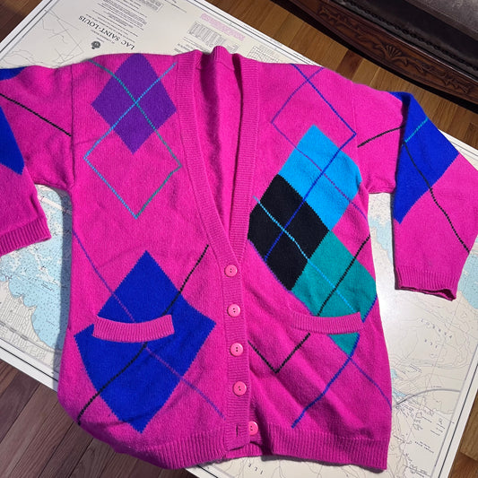 Vintage Pink Argyle Cardigan with Shoulder Pads