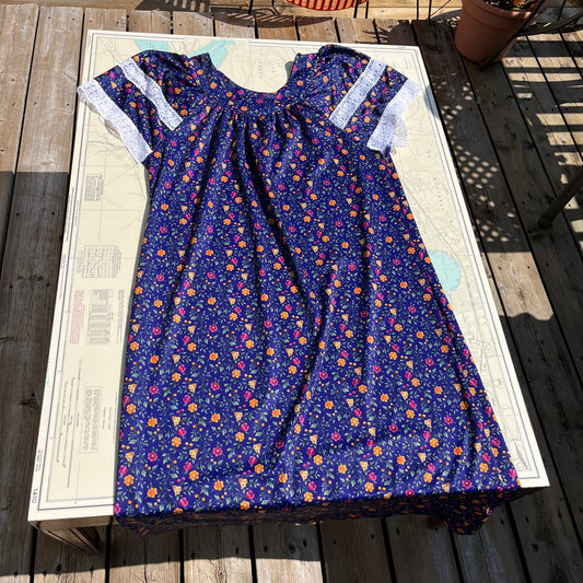 Vintage 80s Hamilton Blue Floral Lace Trim House Dress / Muumuu