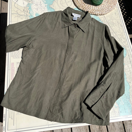 Vintage 90s Silk Land Olive Green Button Up Blouse