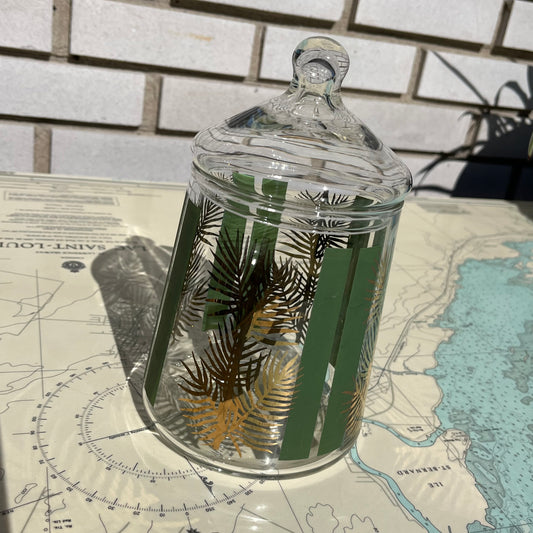 Vintage Glass Canister with Gold Pine and Green Stripes