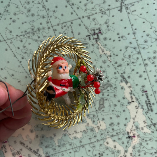 Vintage Mini Plastic Santa Wreath Christmas Ornament