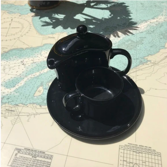 Vintage Curved Black Mod Single Serve Tea Pot / Cup / Saucer Combo Set