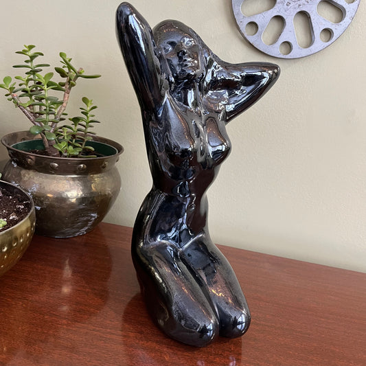 Vintage Black Ceramic Sun Bathing Beauty Exotic Iridescent Sculpture