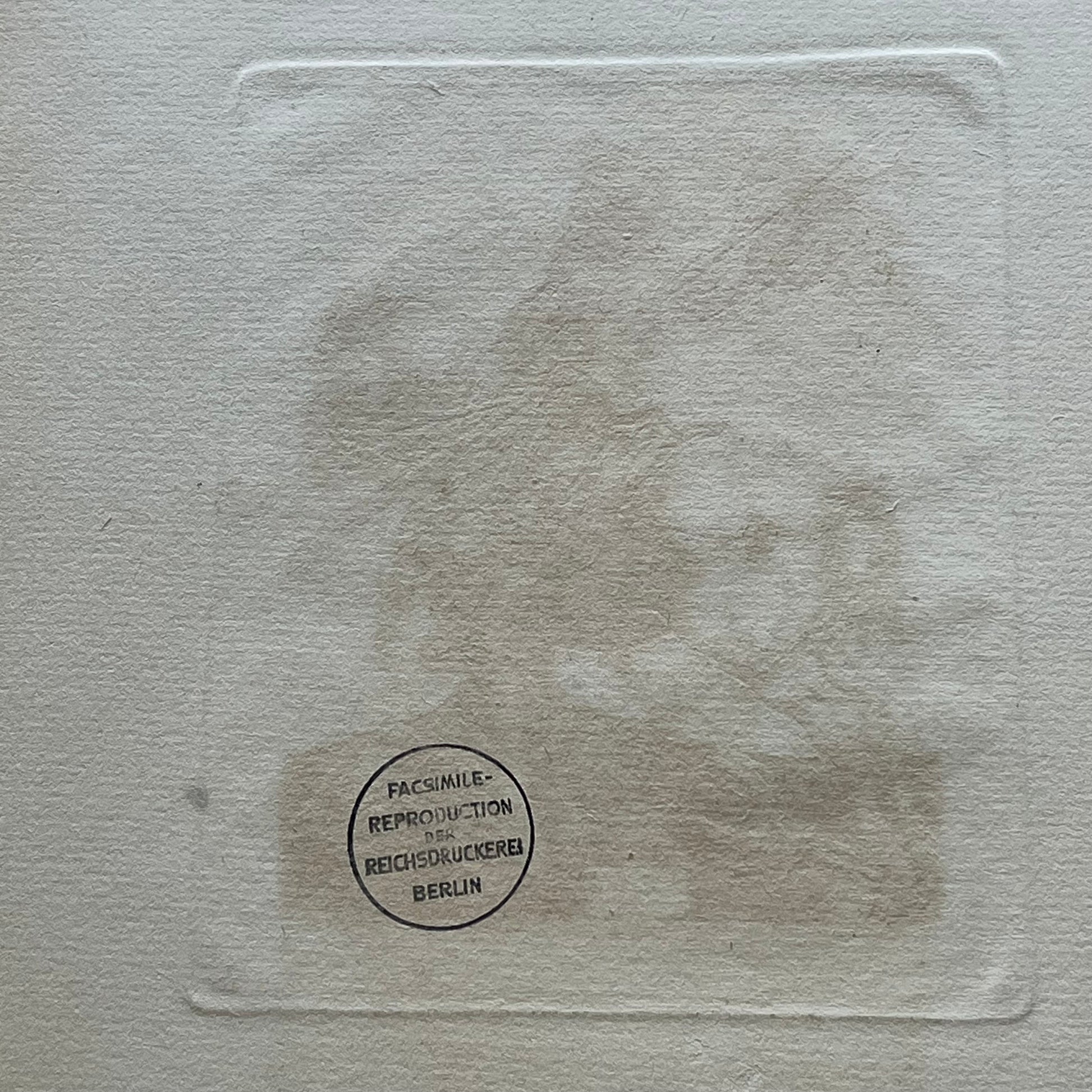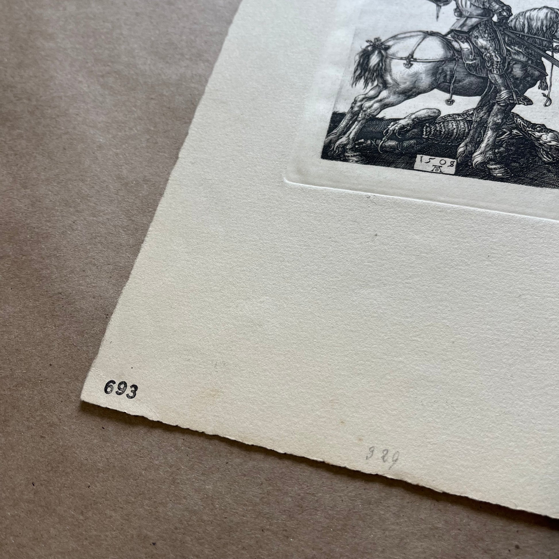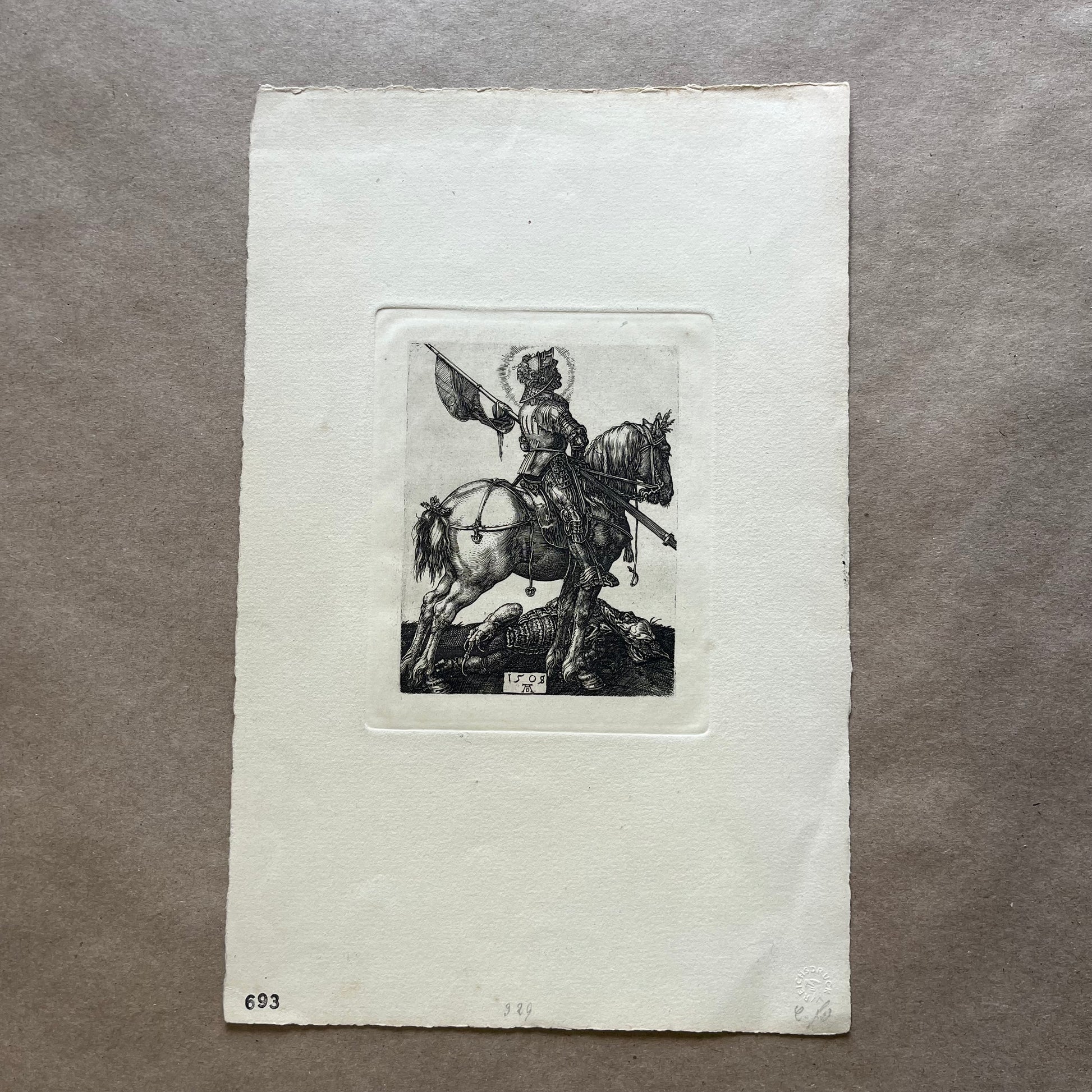 Antique Albrecht Durer engraving "Saint George on Horseback". This engraving dates to the early 20th century and was printed in Berlin as a reproduction of exact quality and detail to the original. This is virtually identical to in every aspect to the original 1508 engraving which can clearly be seen in the images provided. Even printed on hand laid quality paper this is an impressive work of art. Measures 11.5" x 7.5", print margins are 4.5" x 5.25".