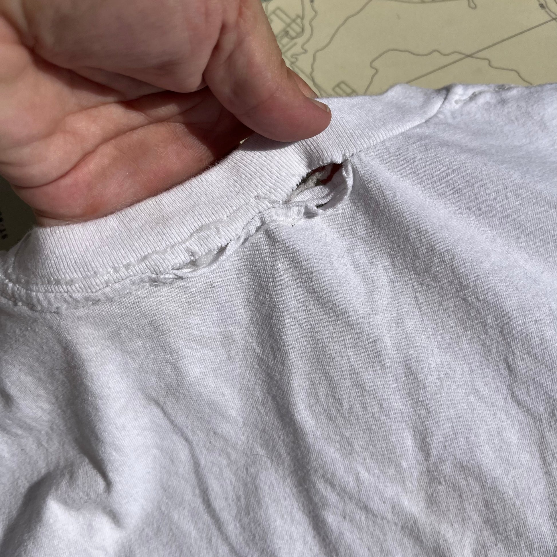 Fleetwood Mac Rumours album cover white and black distressed graphic tee shirt. Good condition, with some holes around the neckline, see photos for details. Tagged as a size medium, measures 17" across shoulders, 18" pit to pit, 25" long.