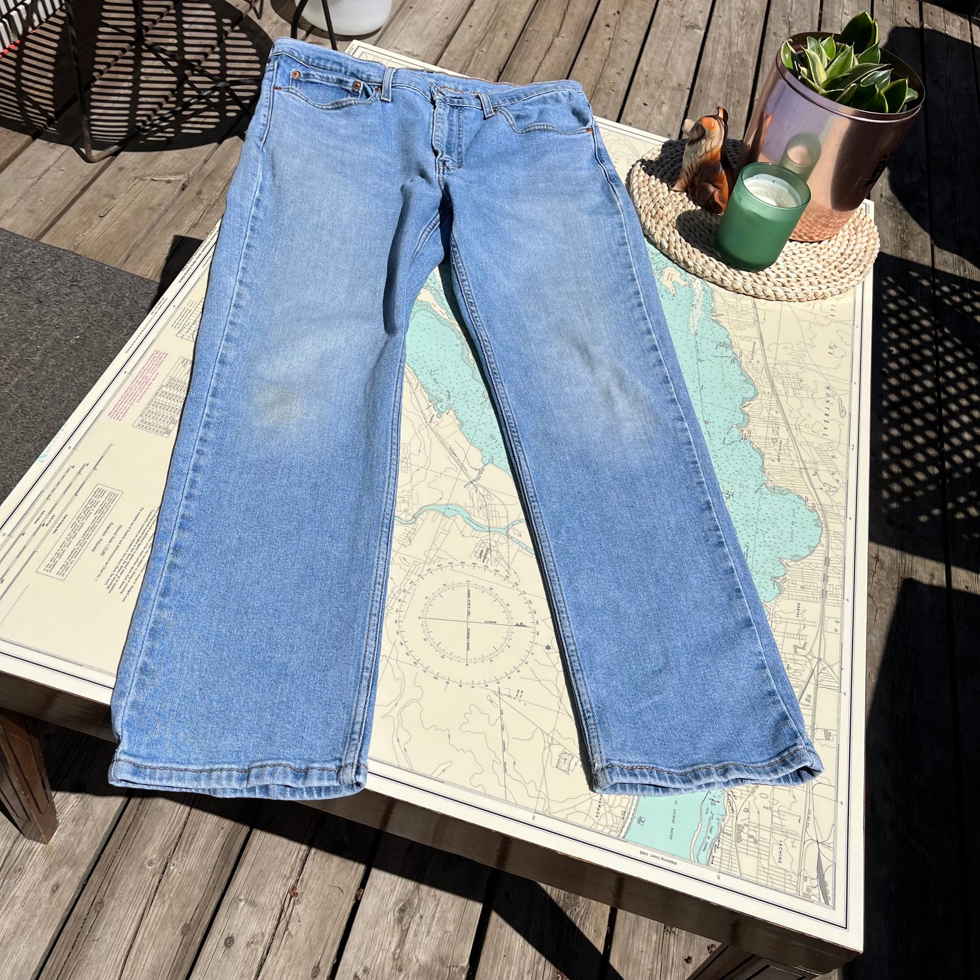 Levi's 514 Straight Jeans 34 x 30. Some discoloured spots in the knee, small hole at back pocket (see photos). Tagged as a 34 x 30, measures 17" across waist, 21" hips, 11.5" rise, 28" inseam.