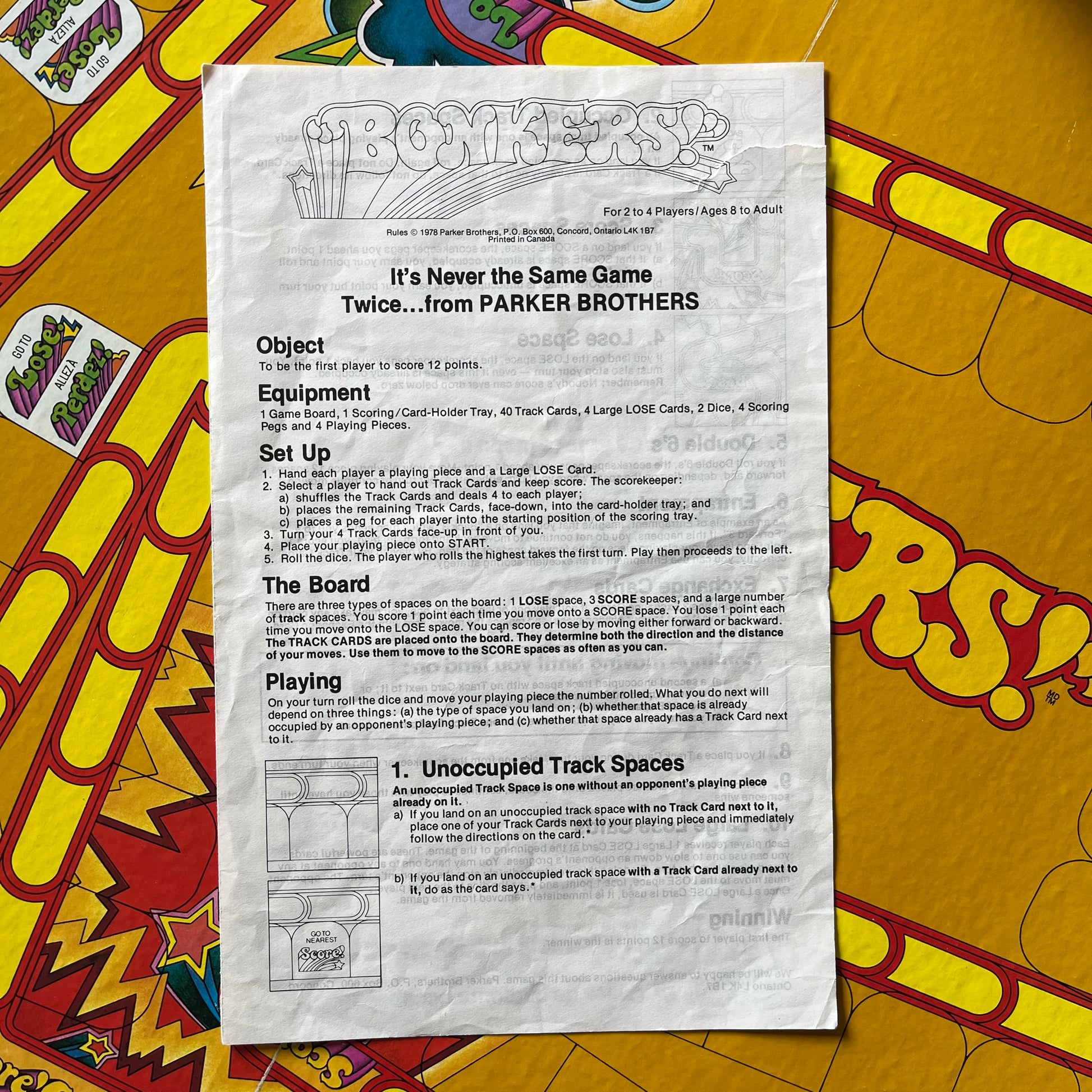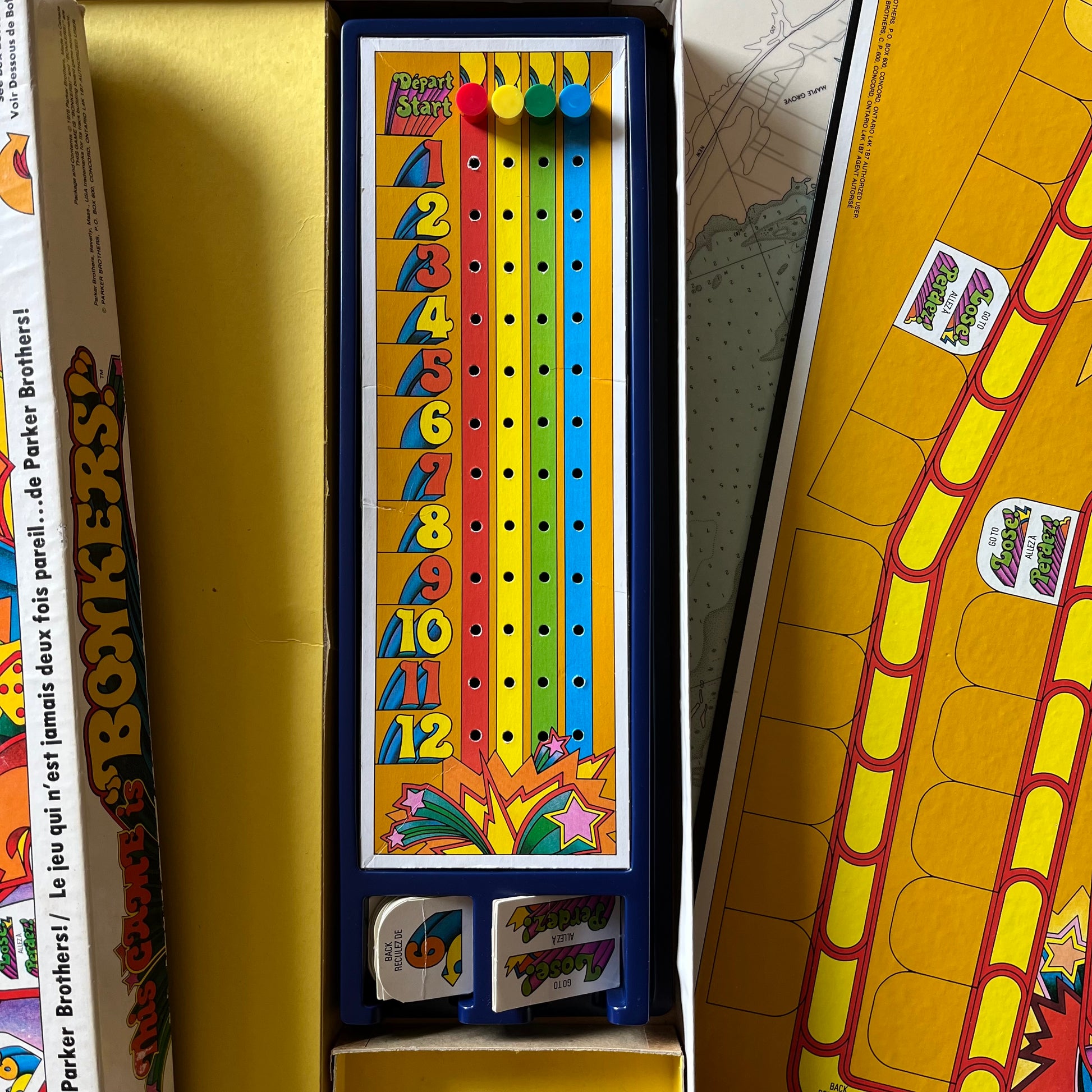 Vintage 1978 This Game is Bonkers Parker Brothers board game. Very good used condition, missing four track cards, includes extra pawn, see photos for details.