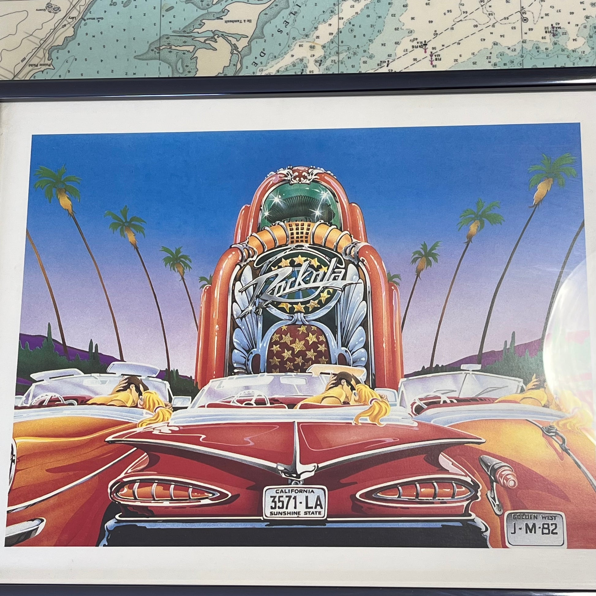 Vintage 1982 Framed Drive In Rock-Ola Jukebox Print by John Mac. Excellent condition, no major signs of wear, see photos for details. Measures 14.5" x 11.5" x 1".
