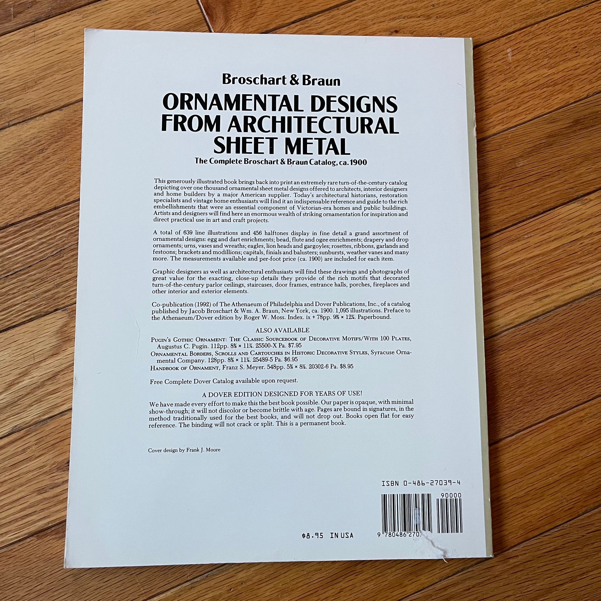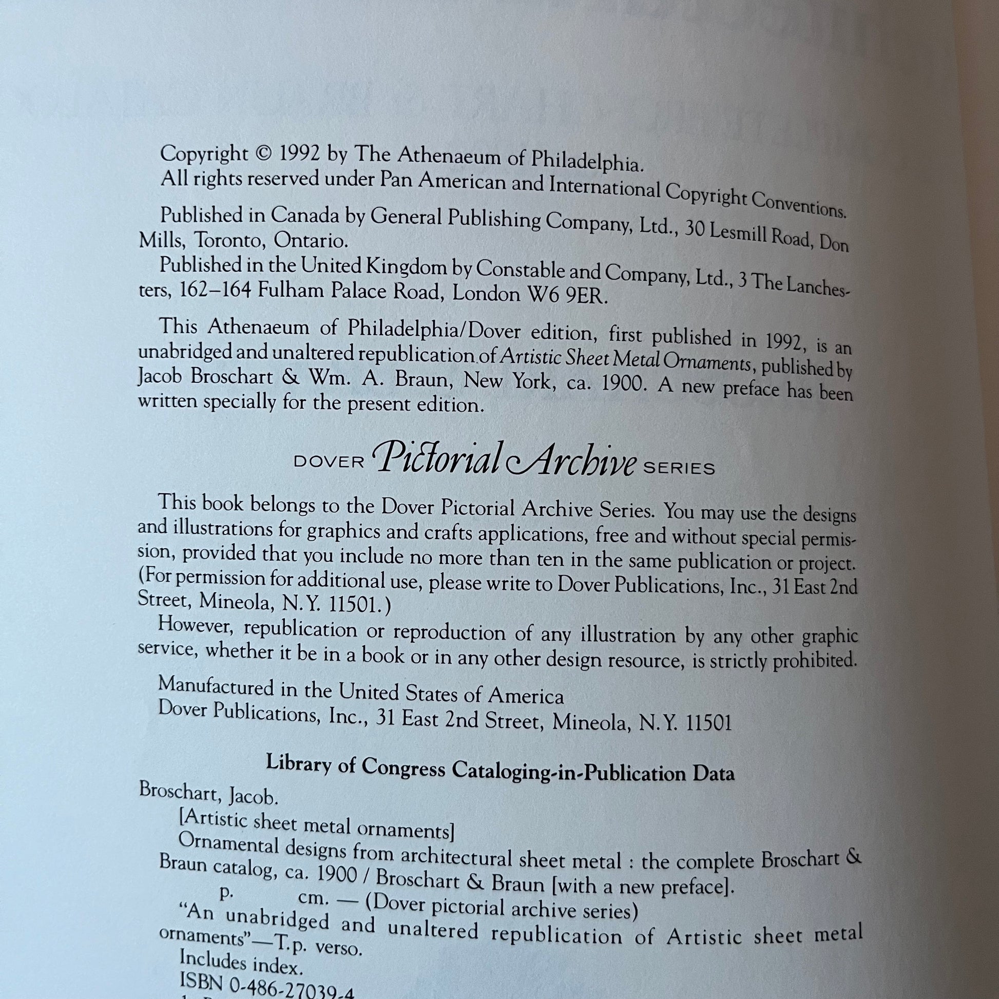 Vintage 1992 Ornamental Designs From Architectural Sheet Metal, the complete catalog from Broschart & Braun, ca. 1900. Very good used condition, see photos for details. Measures approx. 12.5" x 9.5".