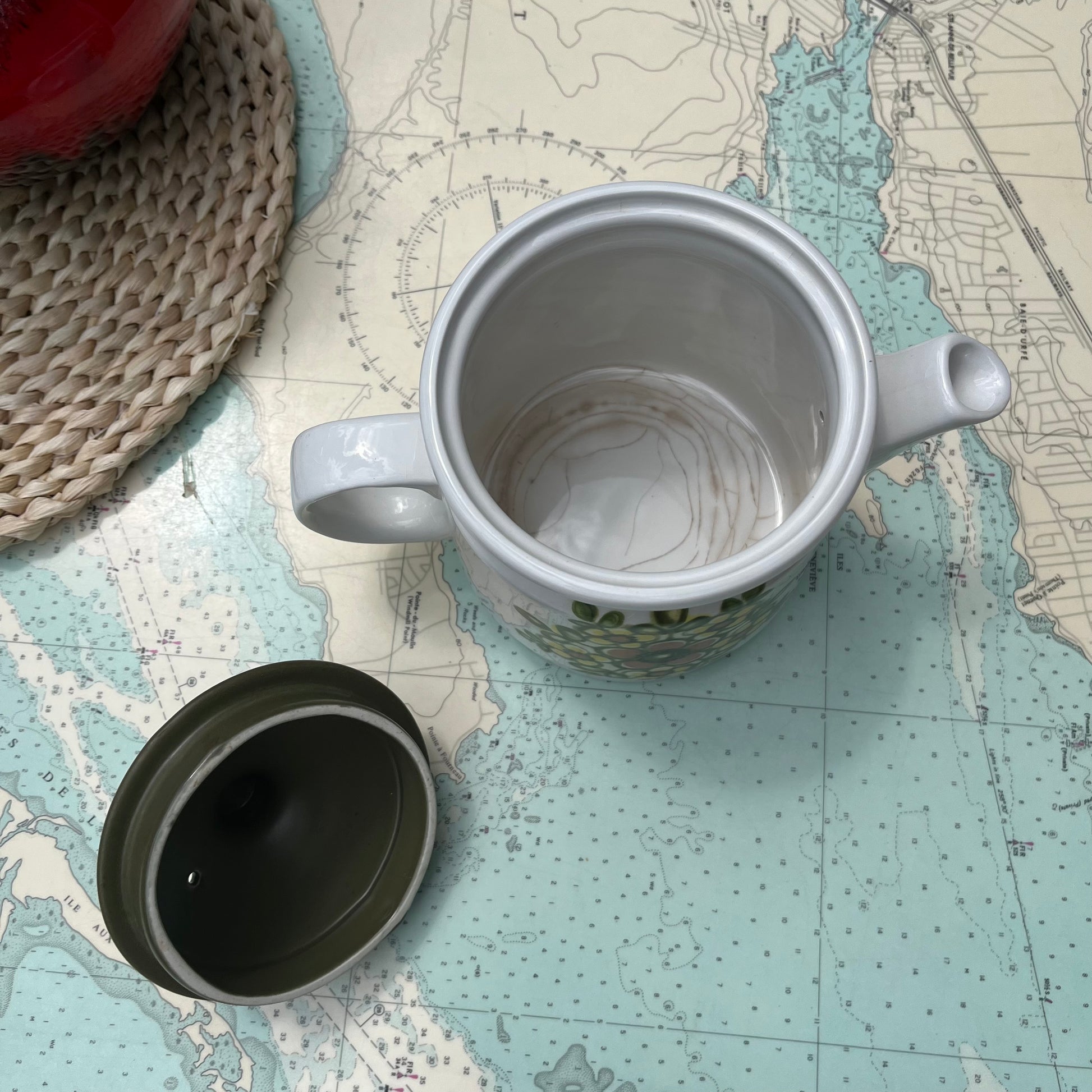 Vintage 60s green and gold floral teapot. Stamped Mirage Ironstone Ware by Myott England on bottom. Good used condition, no chips or cracks however does have some crazing inside, see photos. Measures 8" x 6.5" x 4.75".