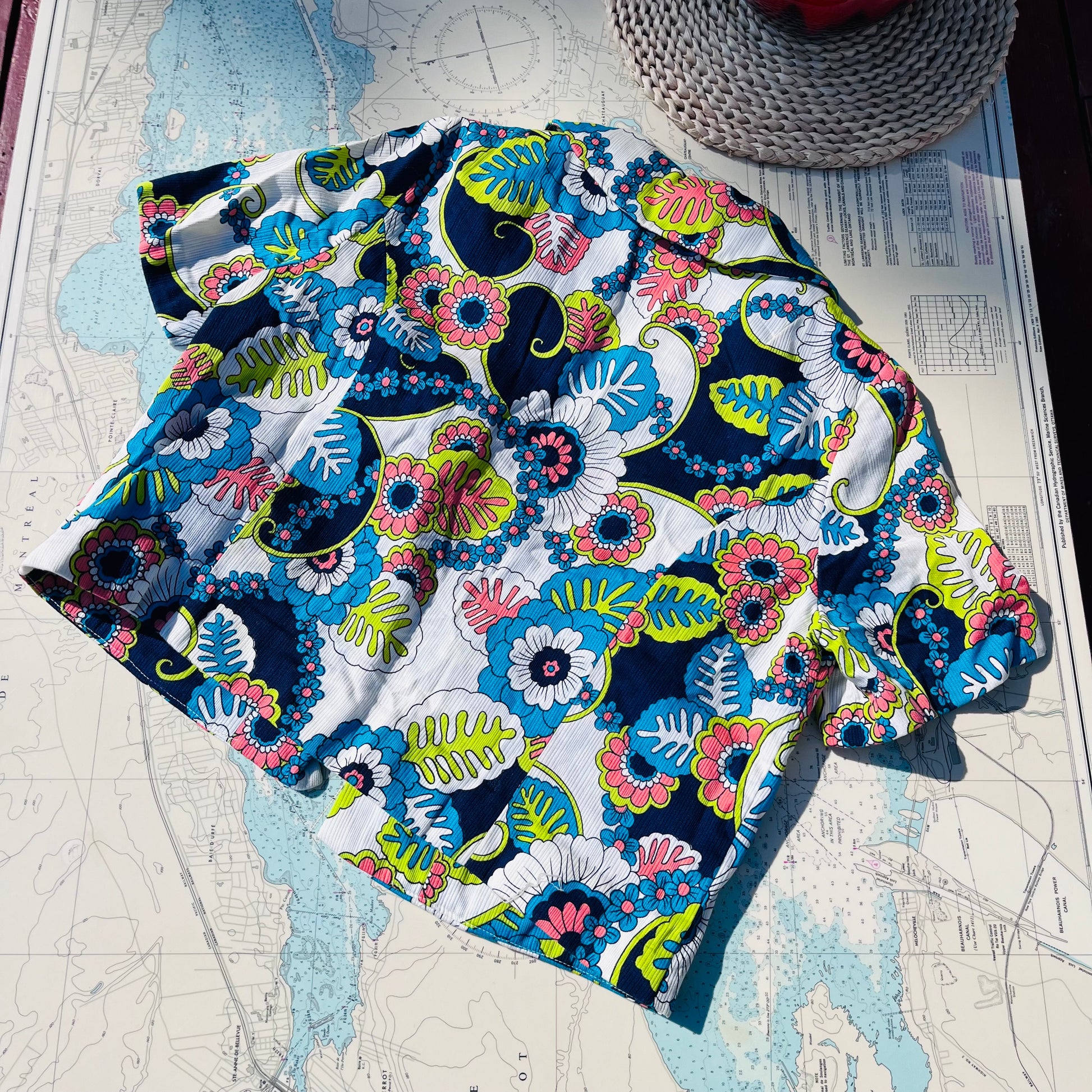 Vintage 60s Funky Floral Polyester Cropped Open Jacket. No tags indicating maker, material or size. Very good condition, no notable signs of wear. Measures 14" across shoulders, 19" pit to pit, 20" long.