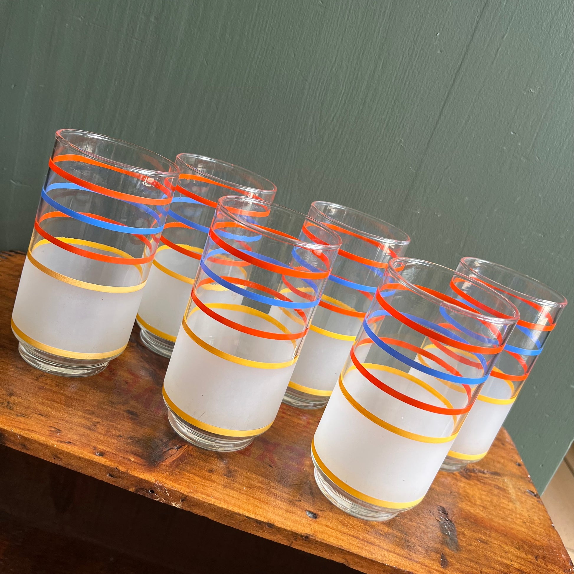 Vintage 60s / 70s Libbey primary coloured striped and etched juice glasses. Set of 6, all in excellent used condition. Some fogging / hard water in the base that I wasn't successful in removing - see photos. Each glass measures approximately. 5" tall, 2.75" wide.