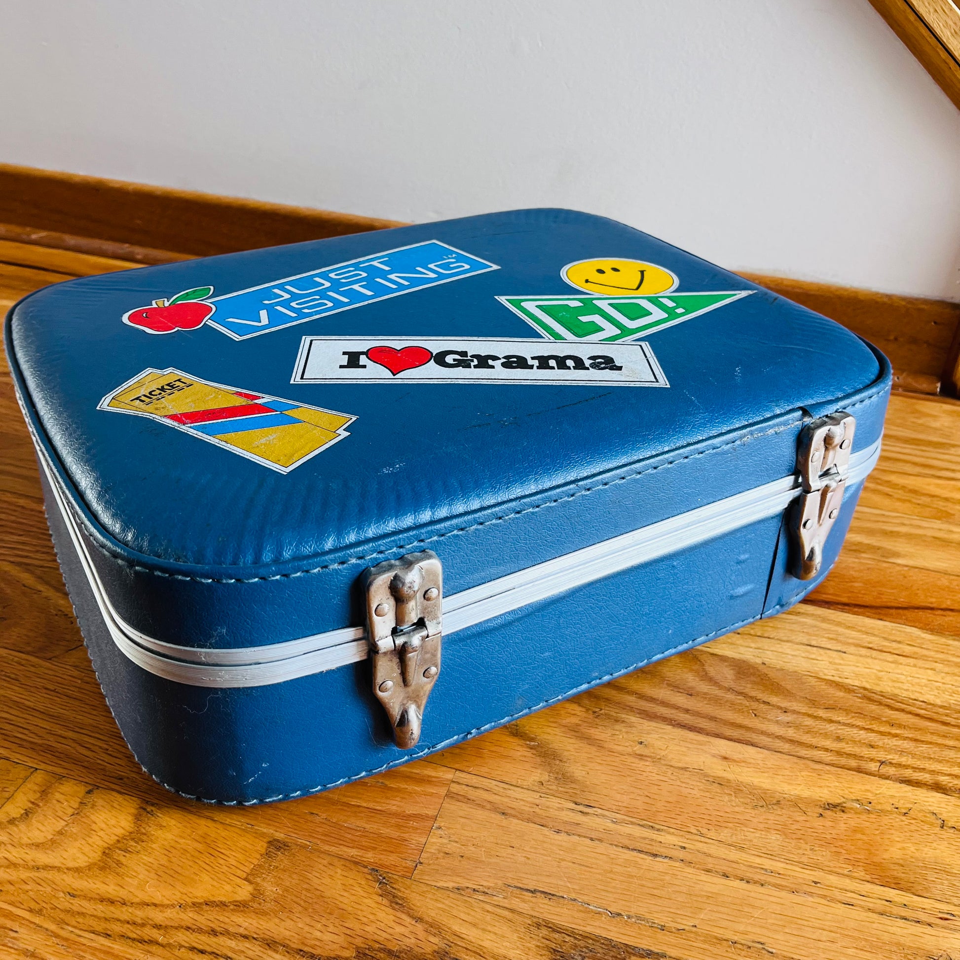 Vintage 70s Children's Blue Travel Suitcase with Decals