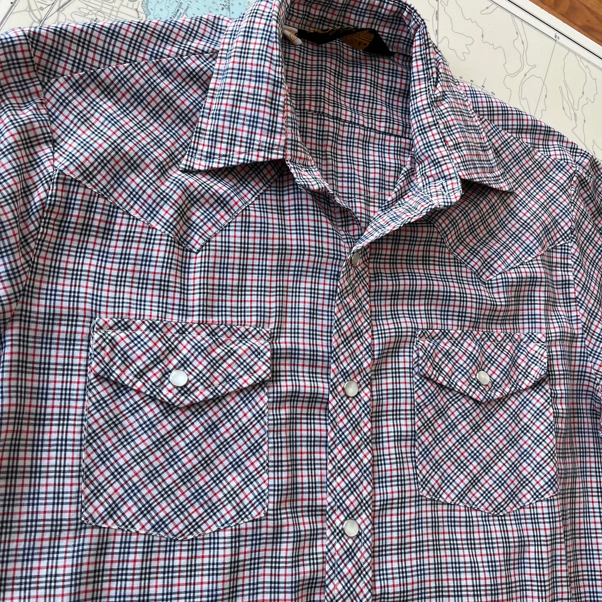 Vintage 70s Style Club Western Button Up Shirt. Red, white and blue pinstripe with pearl snap buttons. Excellent condition, no notable signs of wear. Tagged as a size small, measures 18" across shoulders, 20" pit to pit, 26" long, 25" sleeve.