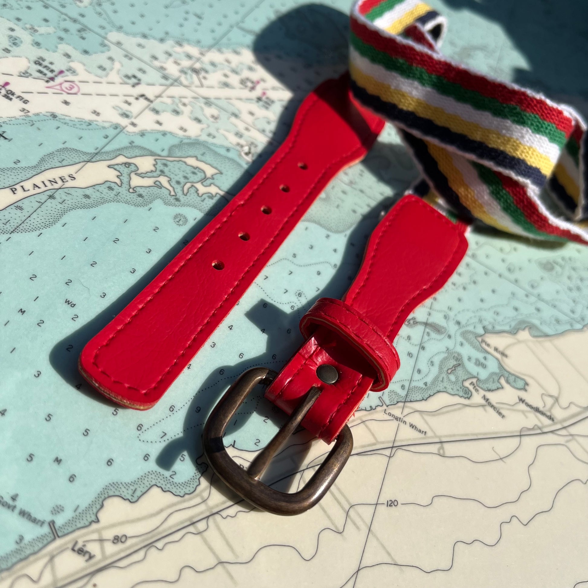 Vintage 80s multi-coloured woven striped belt with red pleather accents. Adorable preppy pop of colour for any outfit! Tagged as a size 36, measures 37.5" long, should fit sizes 34-36"