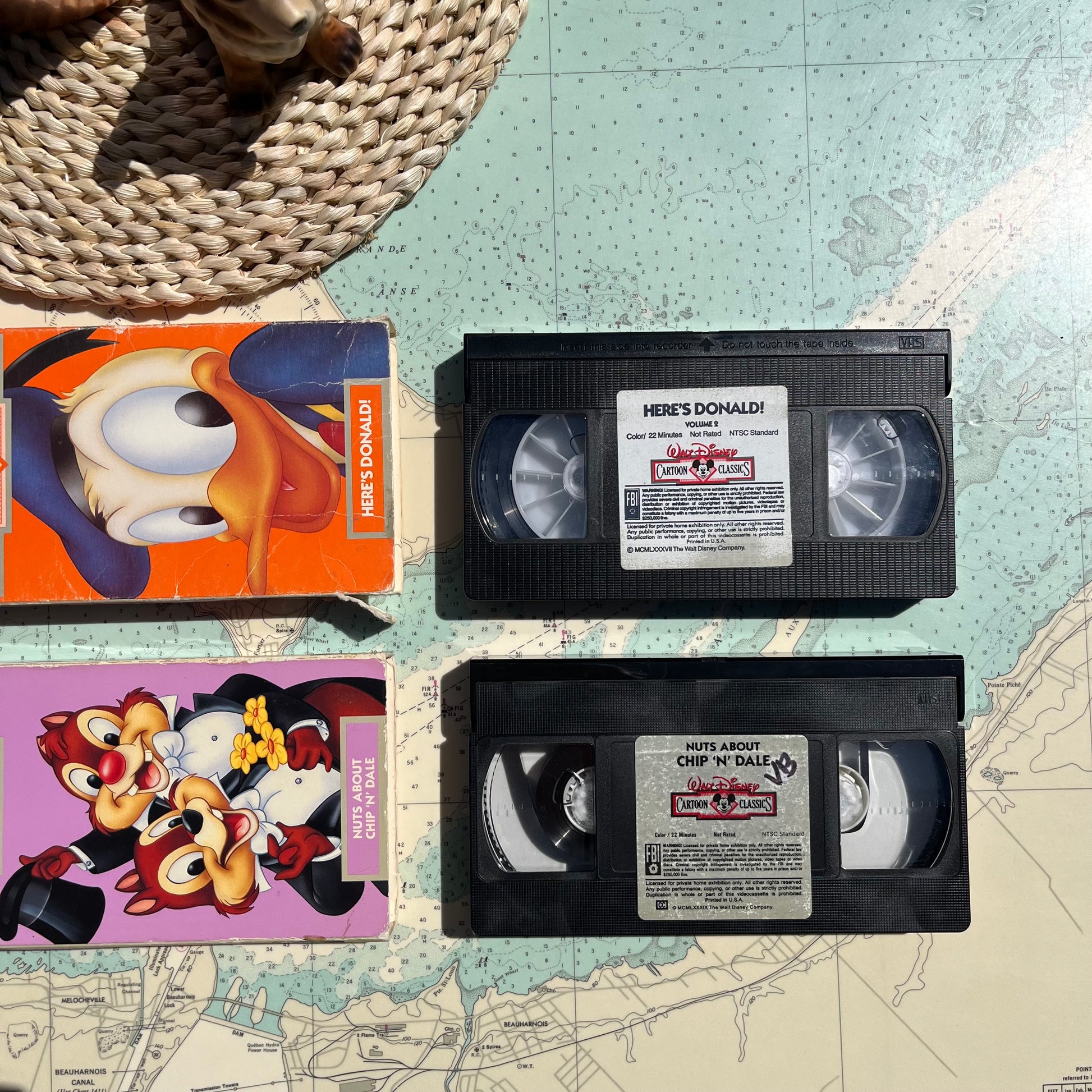 Vintage 80s Walt Disney Cartoon Classics Vol 2 Here's Donald & 12 Nuts About Chip N Dale. Very good used condition, a little wear to sleeves. Both have been tested.