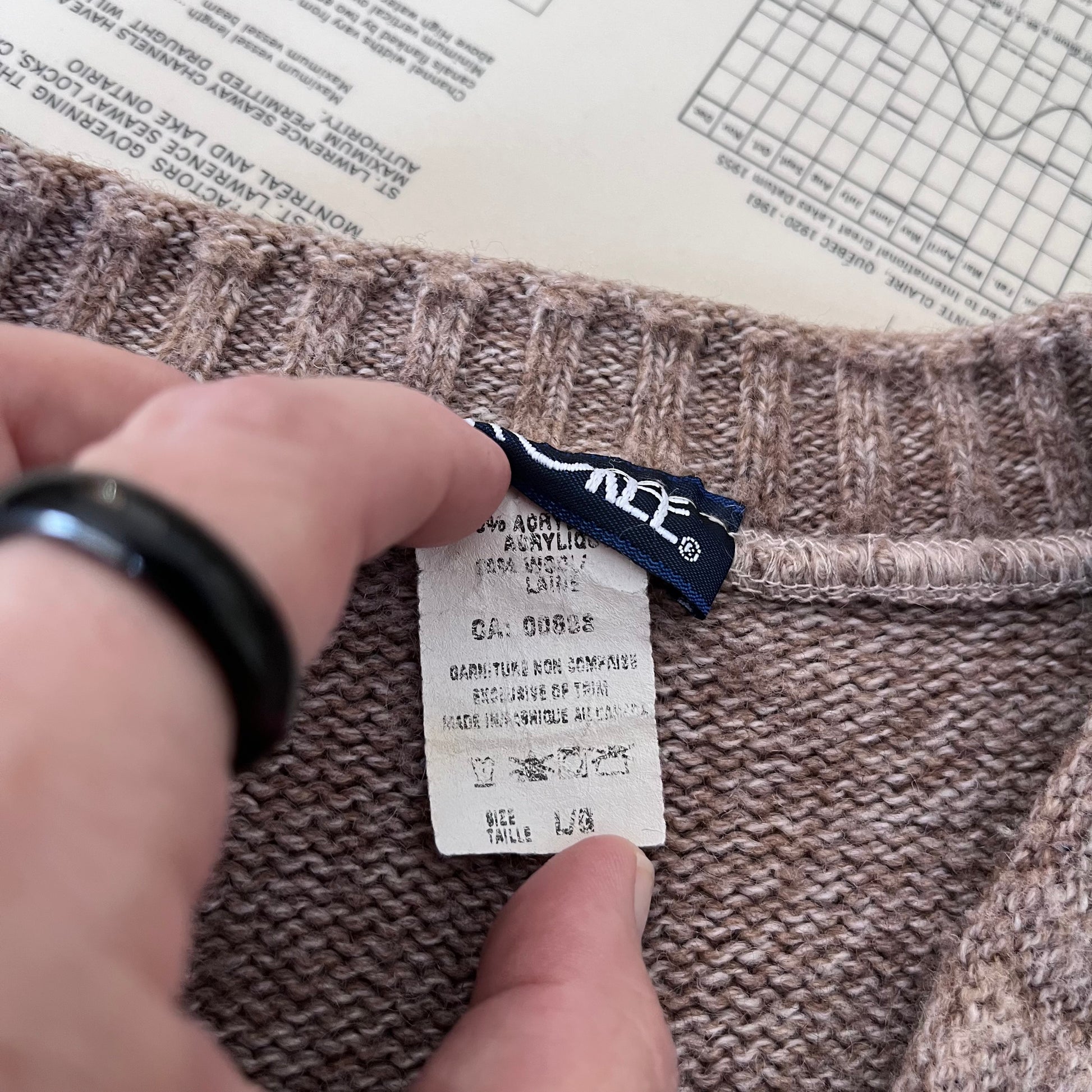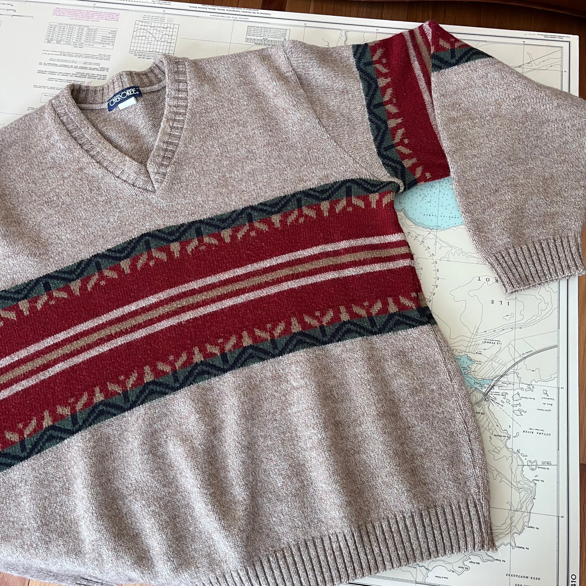 Vintage 90s Cherokee Chest Stripe Sweater. Acrylic wool blend, V neck, tagged as a size large. Measures 20" across shoulders, 26" pit to pit, 29" long.