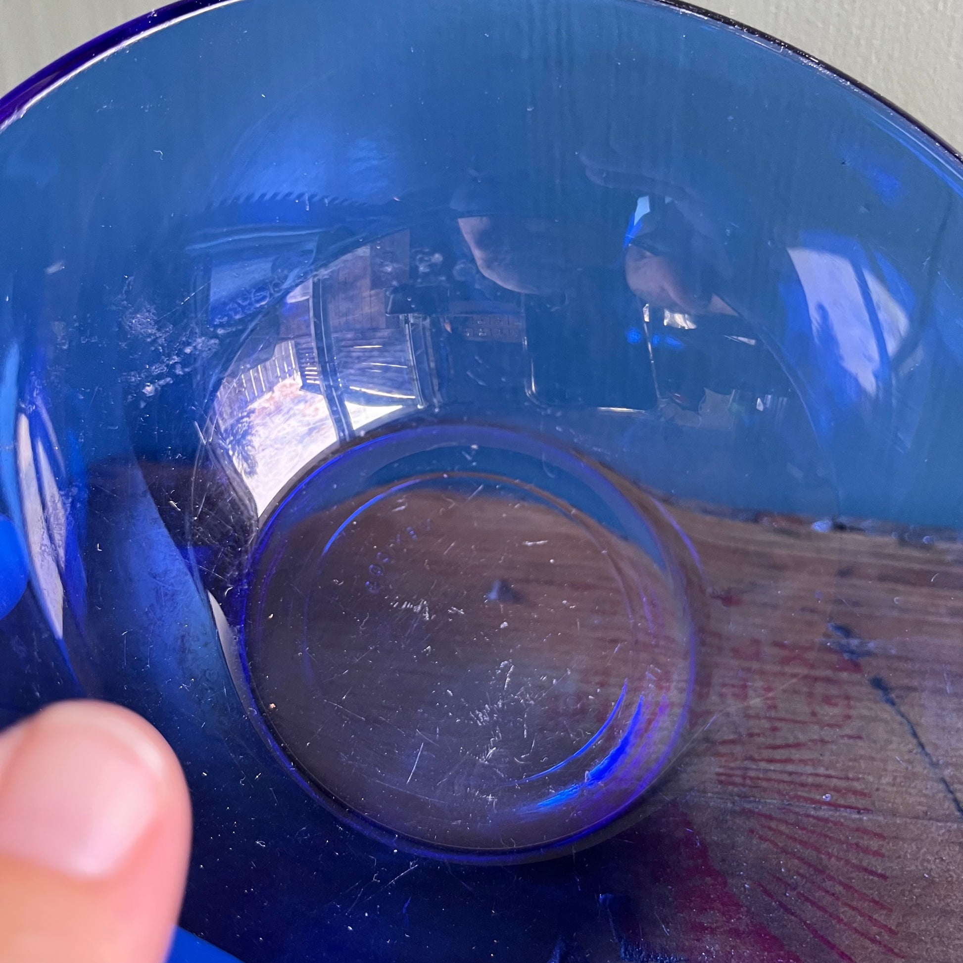 Vintage 90s cobalt blue glass cereal bowl. Marked Mexico on bottom. Some light scratching, see photos for details. Measures 6" wide, 2.75" tall.