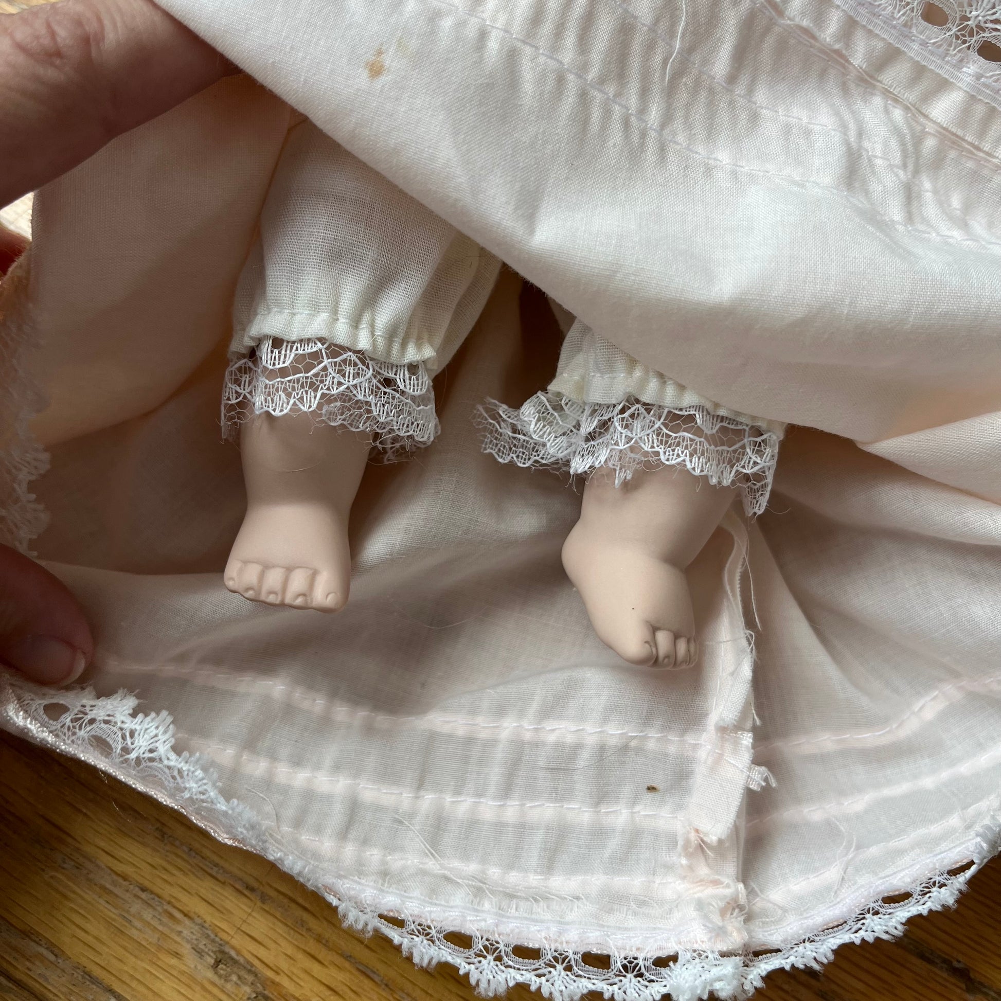 Vintage 90s porcelain crying baby doll with pink lace trimmed dress. Good used condition, has a stain on the dress- see photos for details. Measures approx. 14" tall.