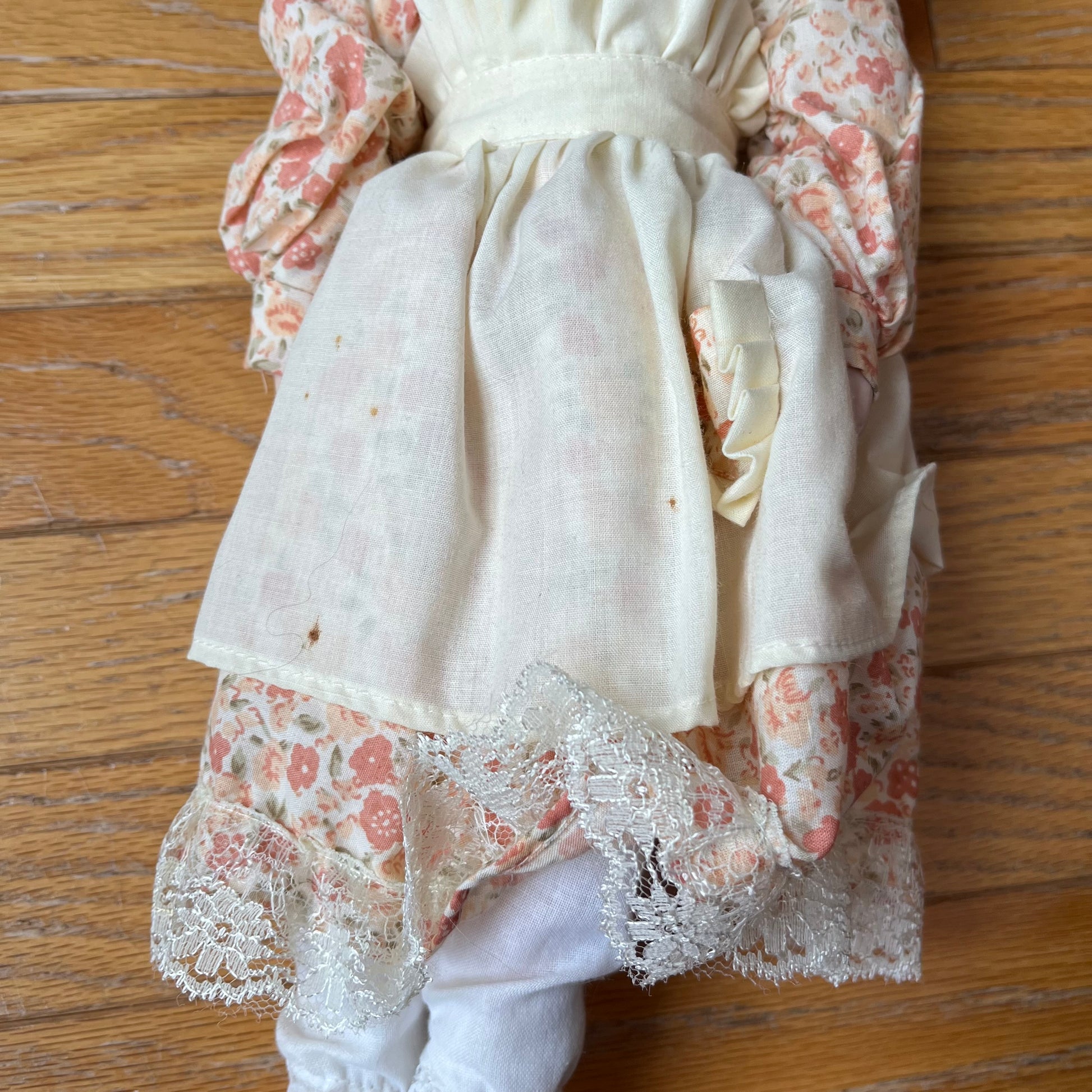 Vintage 90s porcelain doll with floral dress. In original box, dress has some stains - see photos for details. Measures approx. 16" tall.