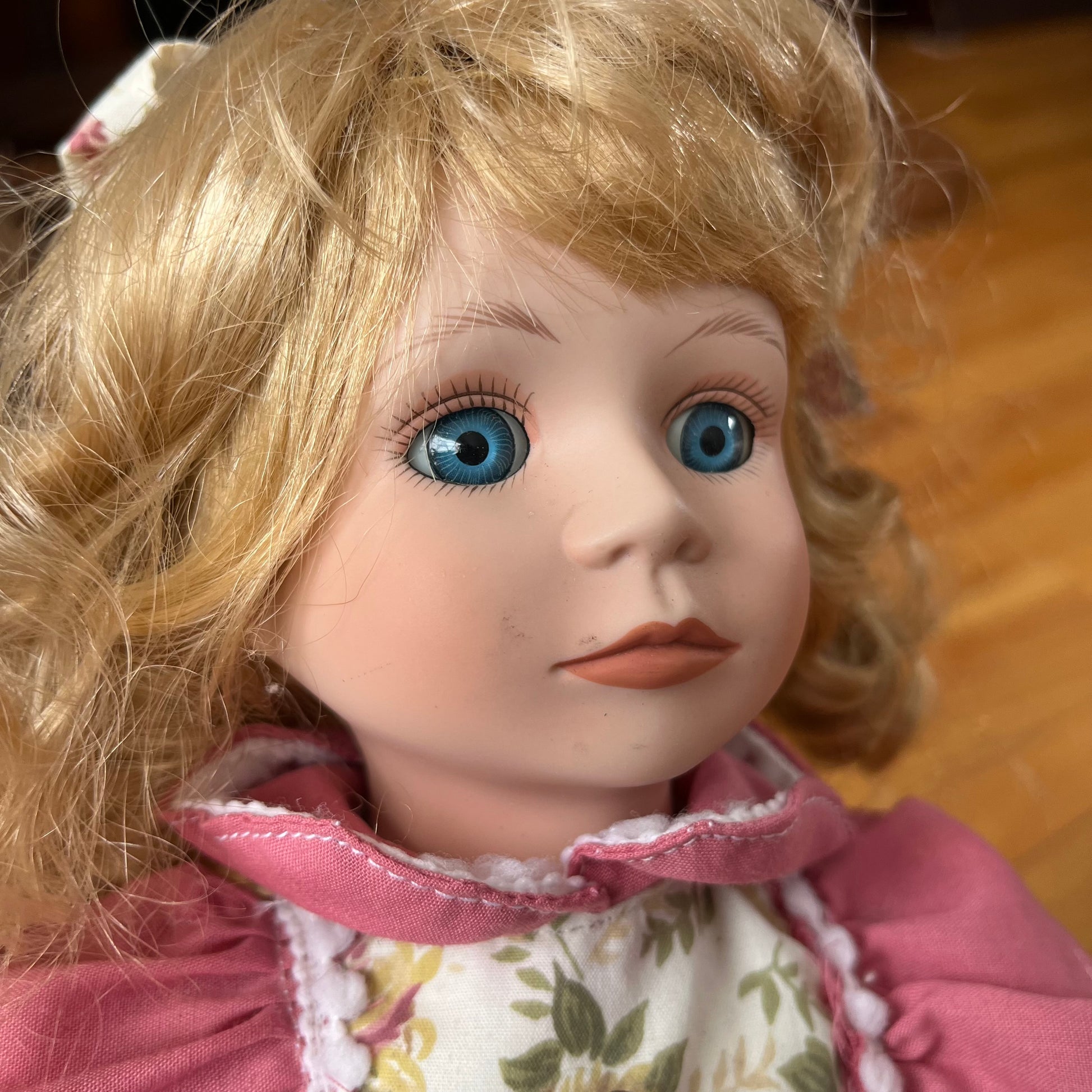 Vintage 90s Porcelain Doll with Pink Dress. 18" tall with metal stand, shows some light scuffs to face, wear consistent with age.