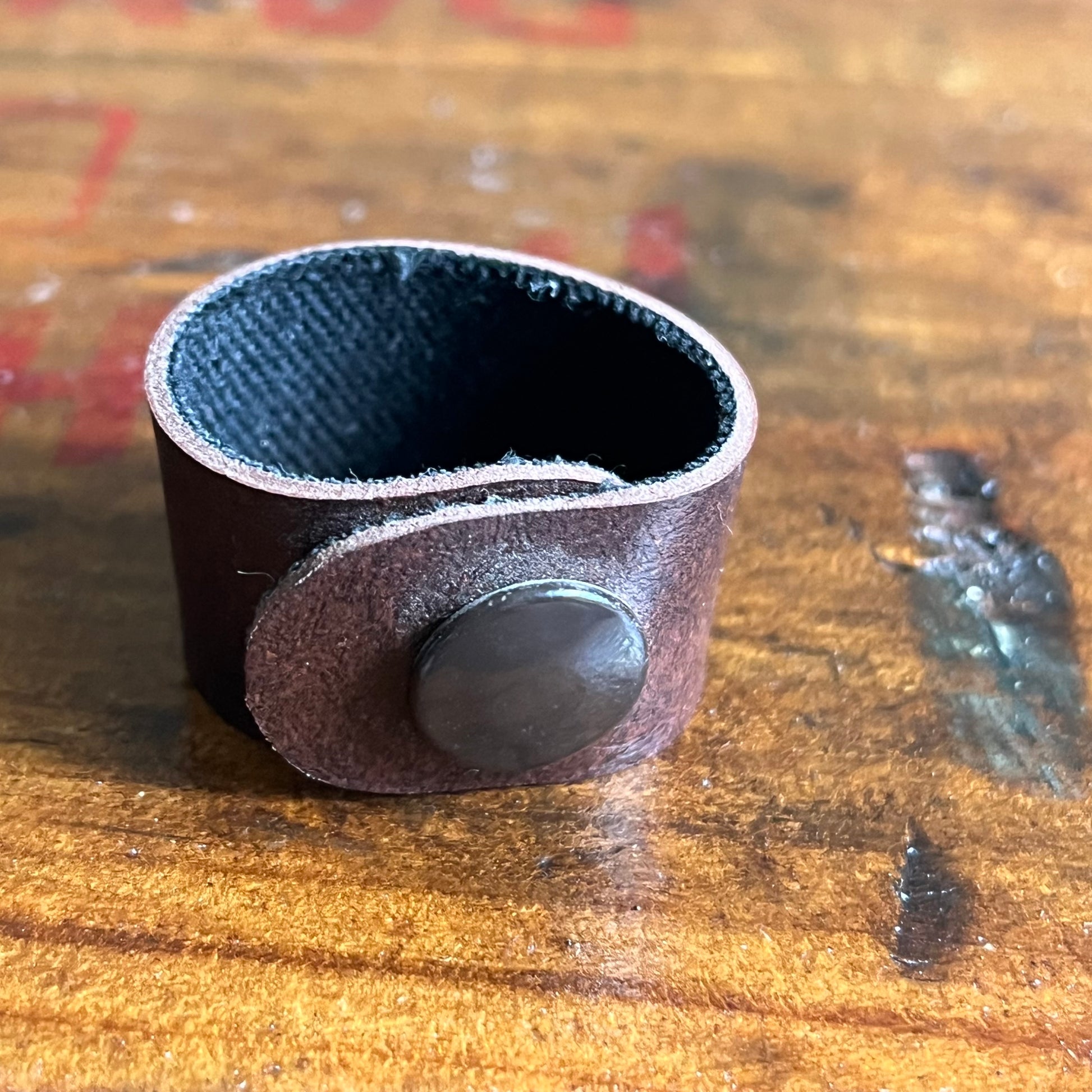 Vintage Boy Scouts leather wolf scarf holder / neckerchief slide. Metal snap fastener, in excellent condition, measures .75" wide, 4.25" long when open.