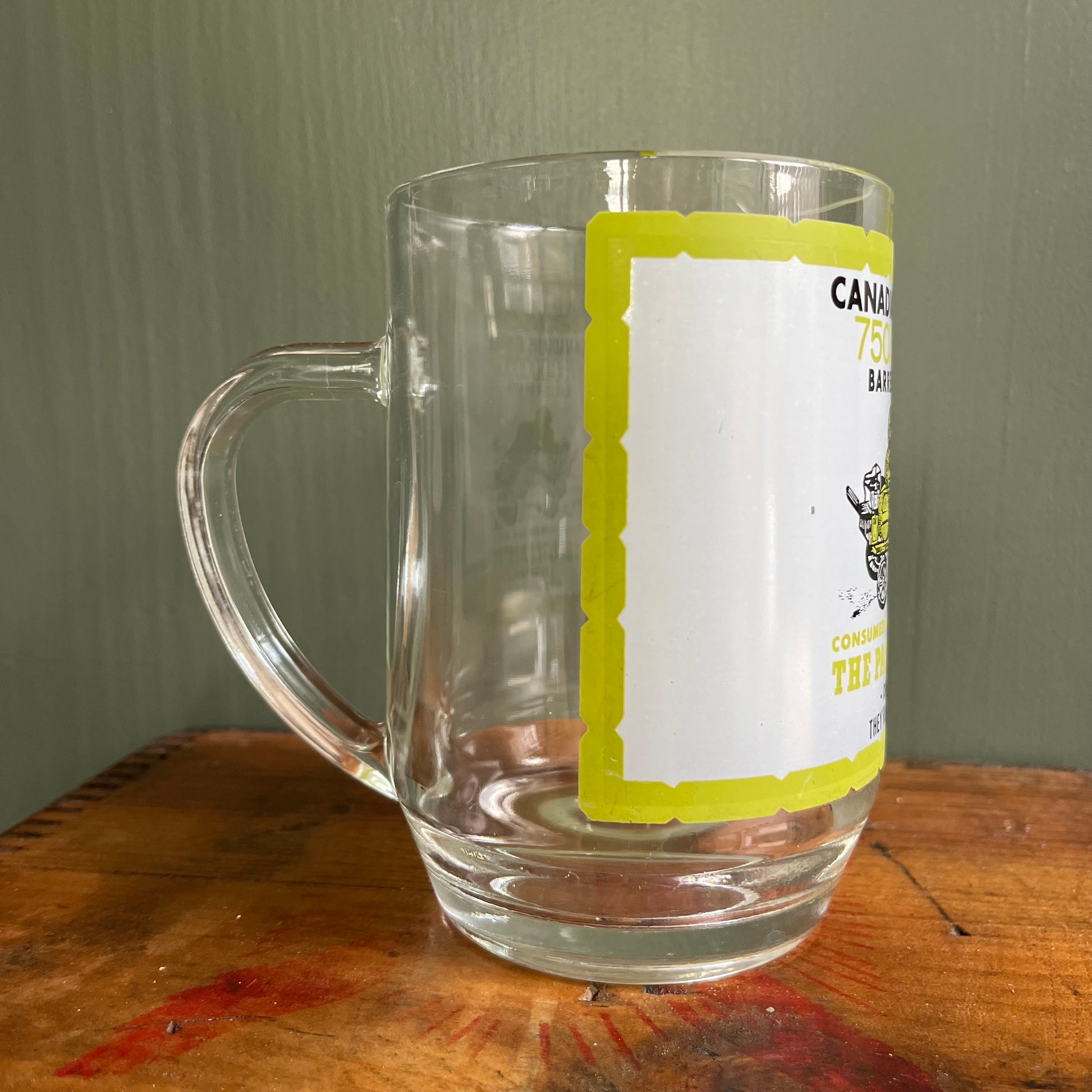 Vintage Canadians Beware graphic glass beer stein / mug. Graphic says " Canadians Beware: 750,000,000 Barrels of Beer Consumed in the USA during the past 2 months -drink up- they're gaining on us". Stamped France on the bottom. Measures approx. 5" x 5.5" x 3.5".