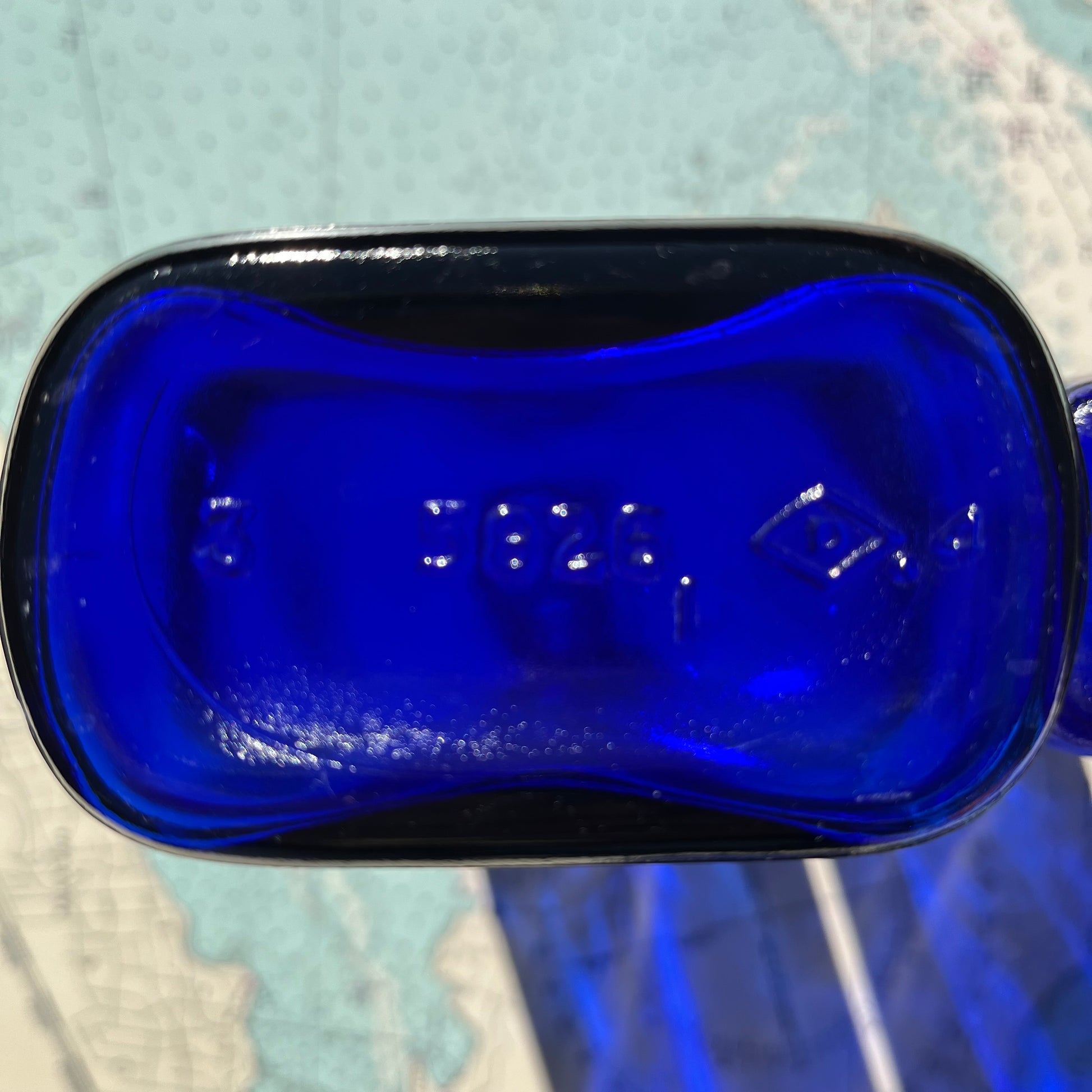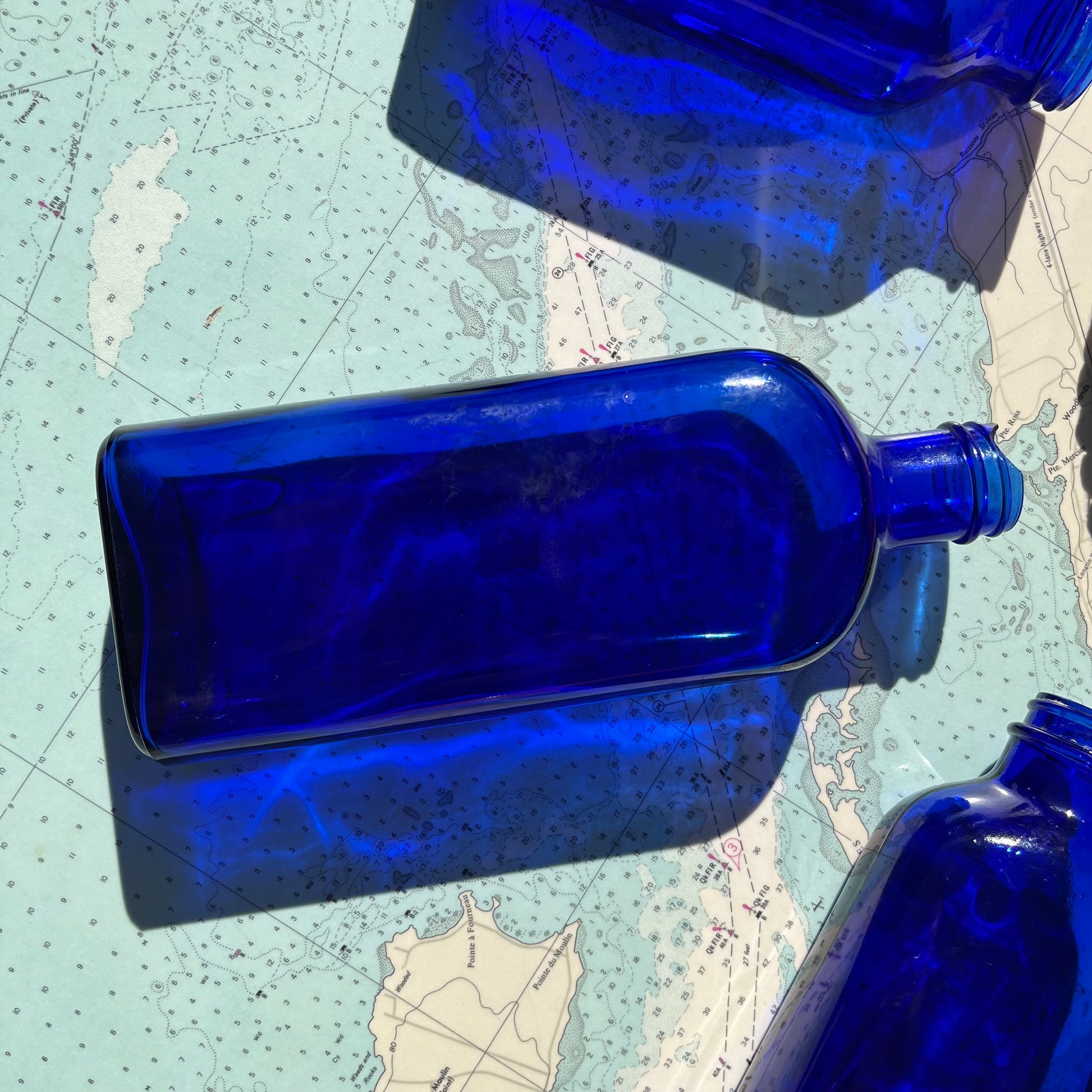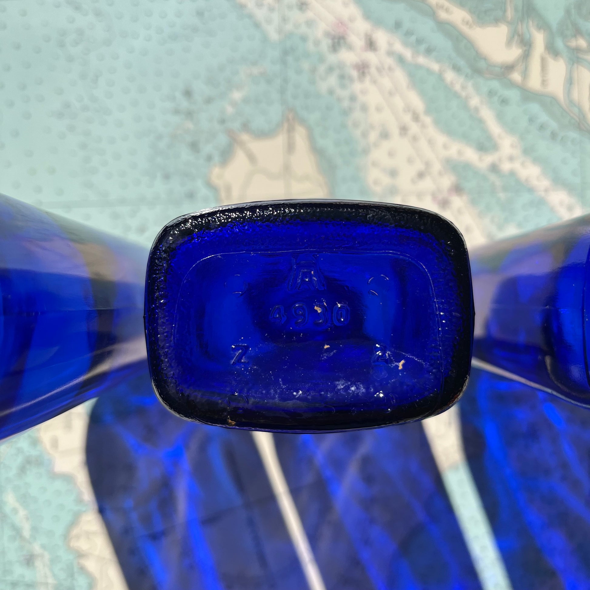 Three vintage cobalt blue glass bottles. Each shows some wear, see photos, tallest has chip at rim. Two smaller measure approx 7.5" x 2.75" x 2". Taller measures 9" x 3.5" x 2"
