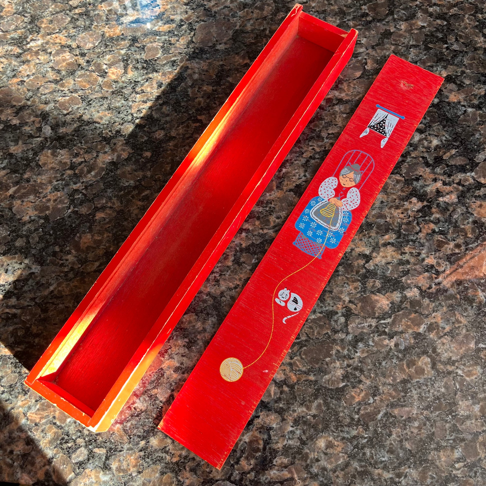 Vintage Hand Painted Knitting Needle Box with Granny and Kitty. Very good used condition, a little wear around the edges, see photos for details. Measures 17" long, 2.75" wide, 1.5" deep.