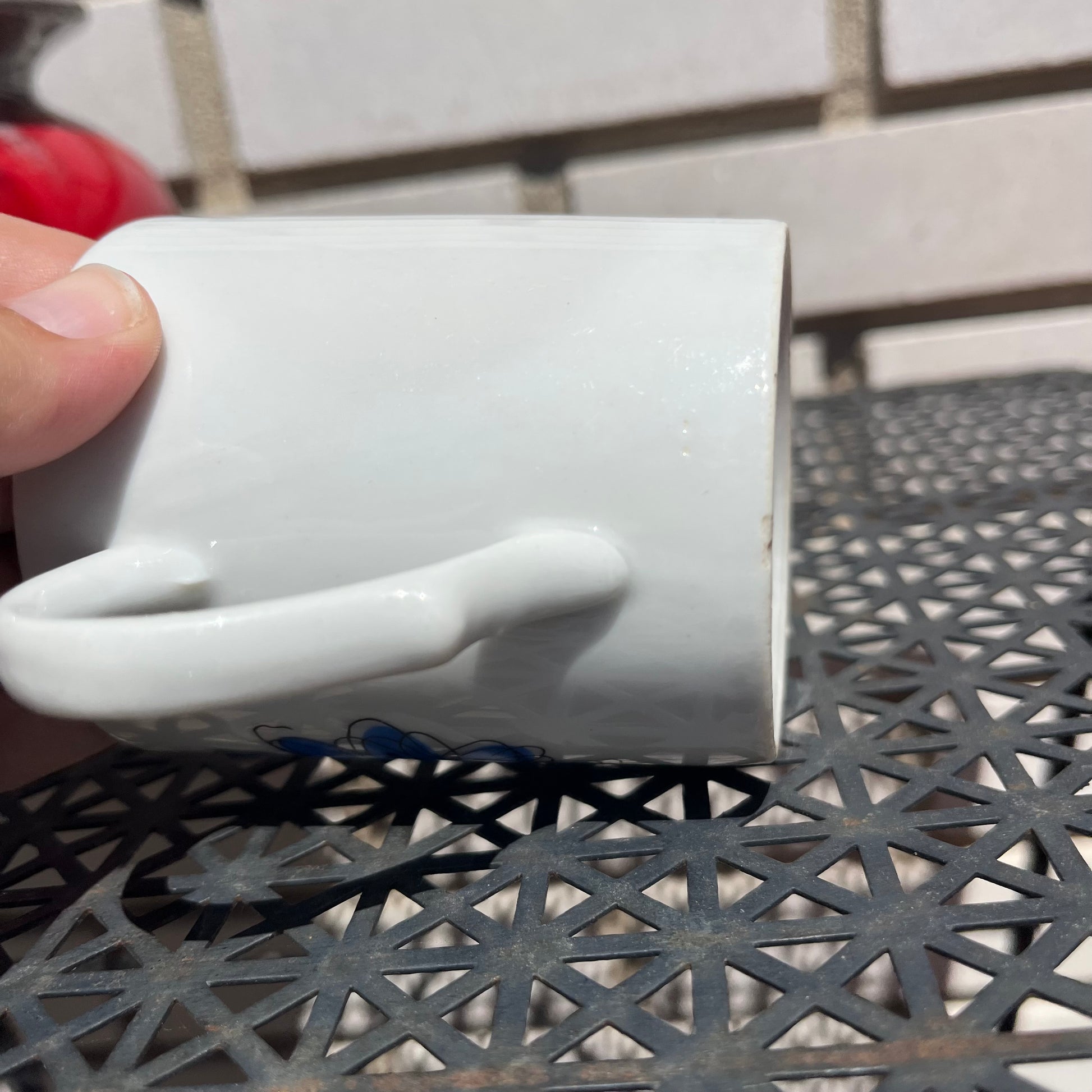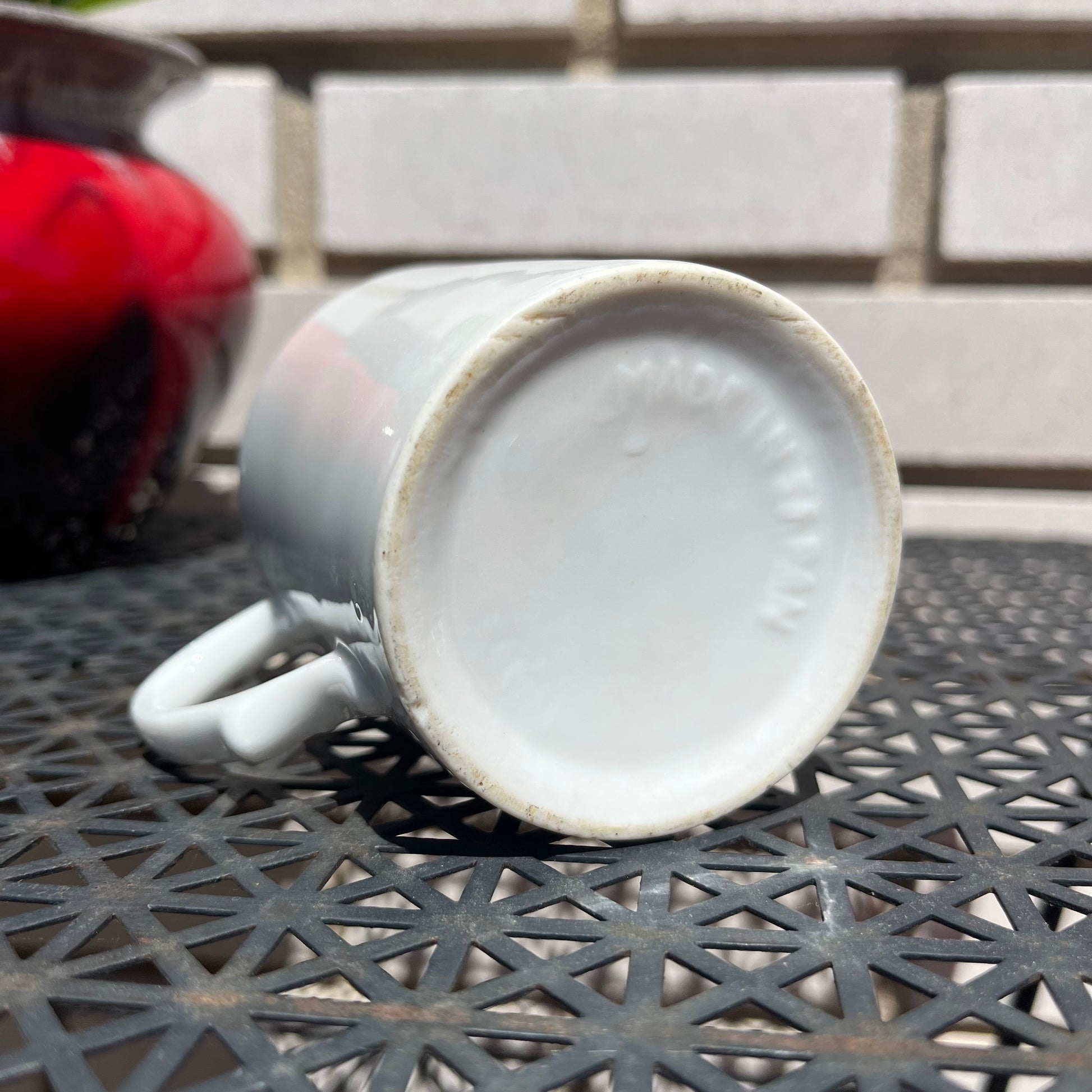 Vintage Japan blue daisy flower graphic mug. Lovely detail on handle, ceramic with raised lettering on bottom. Measures approx. 3.25" tall, 2.75" wide, 4" with handle.