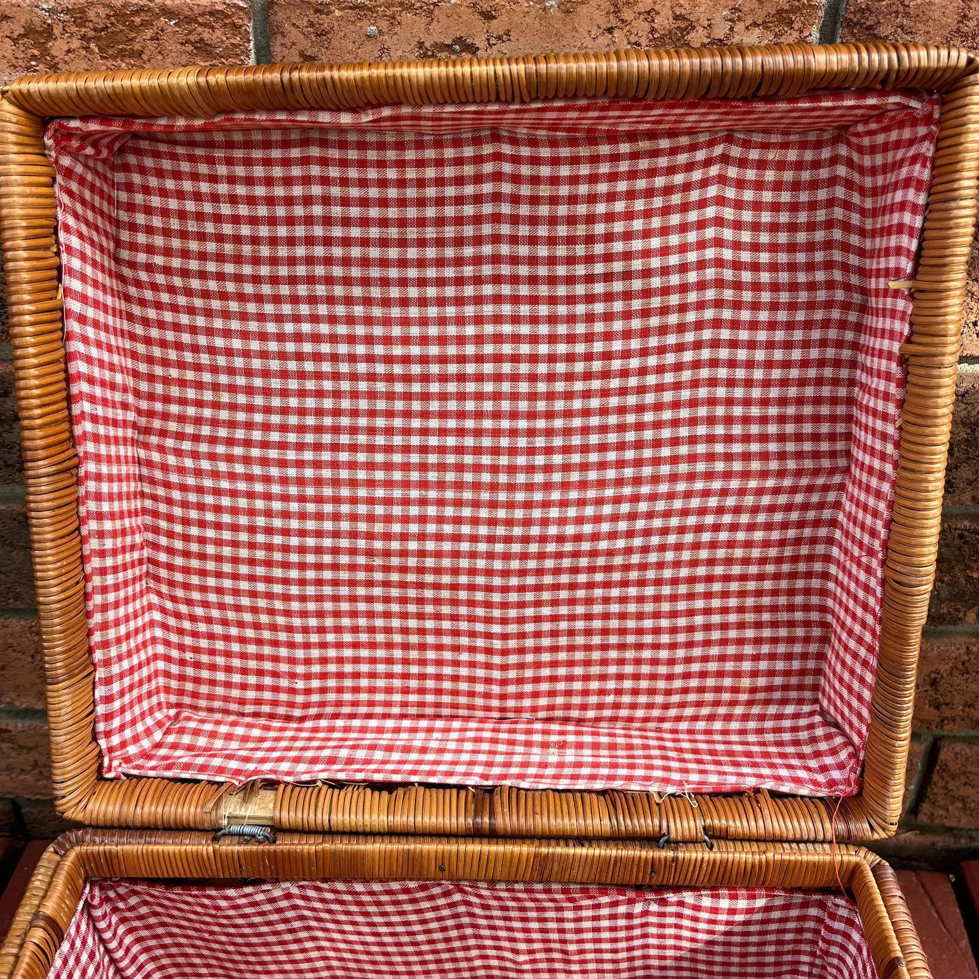 Vintage Large Square Wicker Picnic Basket with Gingham Fabric Lining