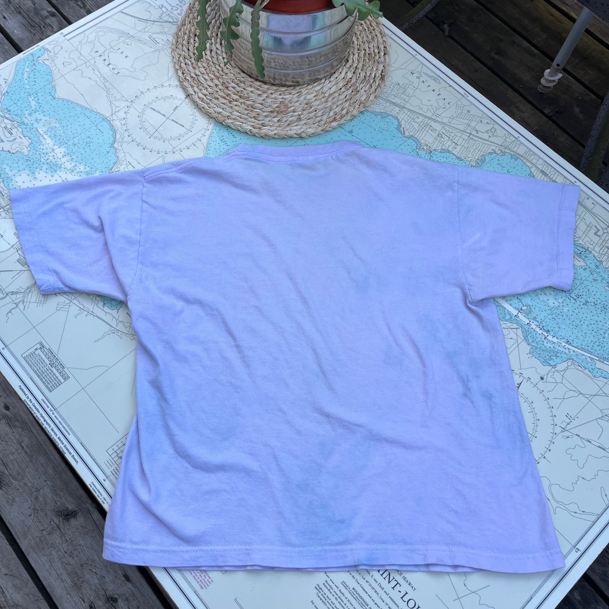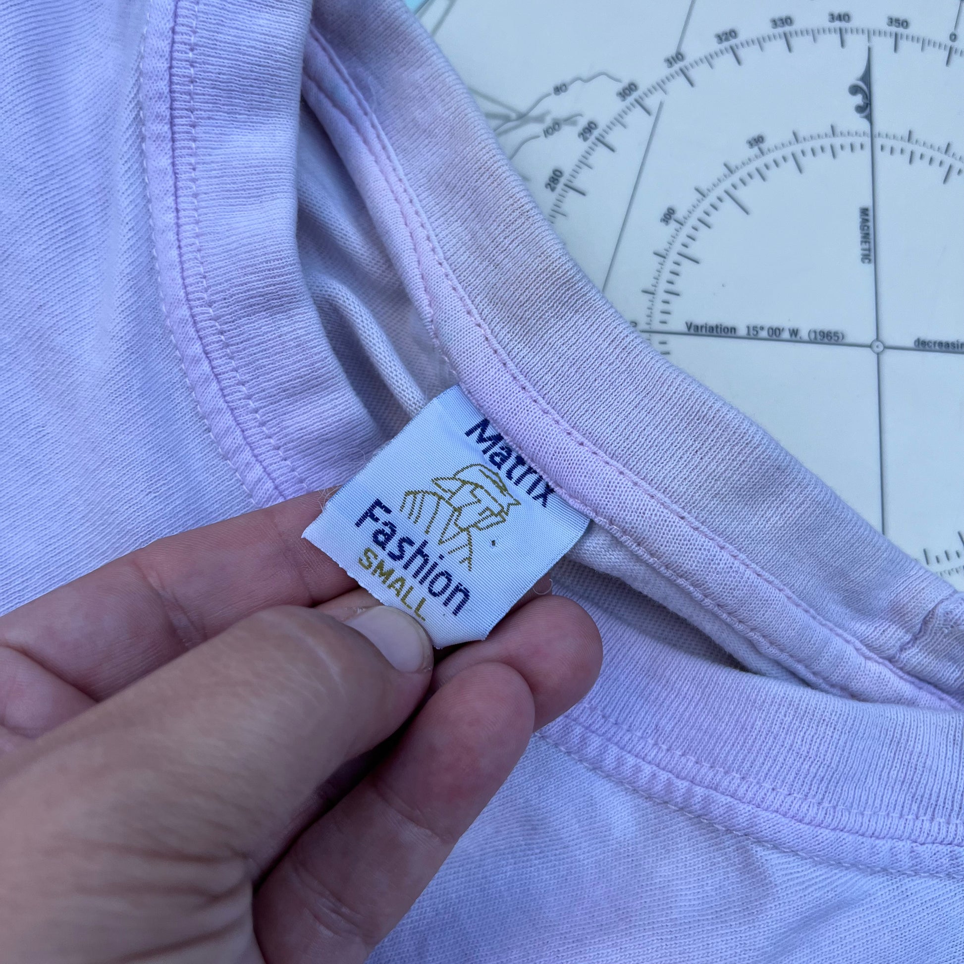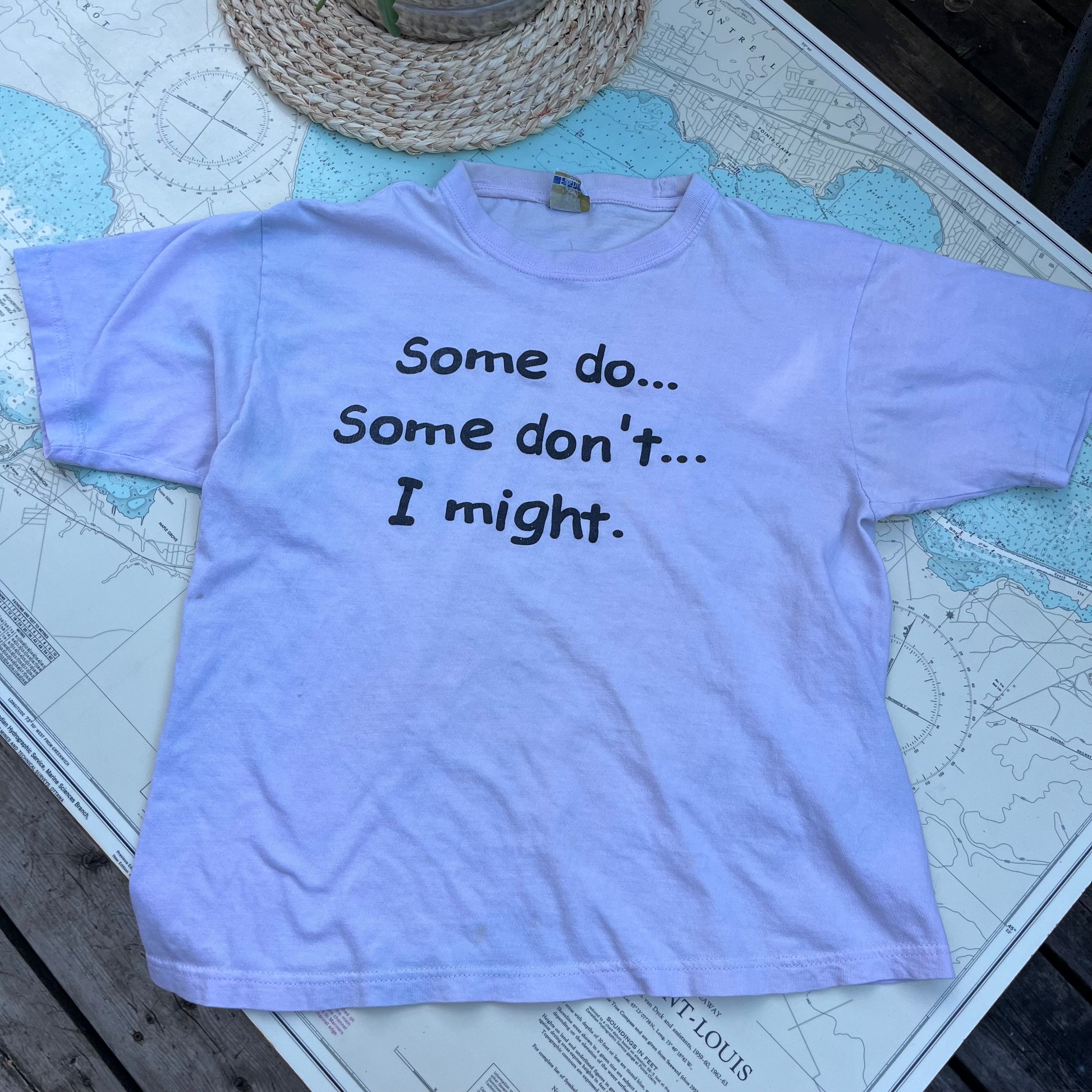 Vintage Matrix Fashion 'Some do... Some don't... I might' distressed graphic tee shirt. Seems like it was originally pink, then dyed blue or washed with something that transferred - pics don't really do it justice. Has some stains, see photos. Made by Matrix Fashion, tagged as a size small. Measures 18" across shoulders, 18" pit to pit, 20" long.