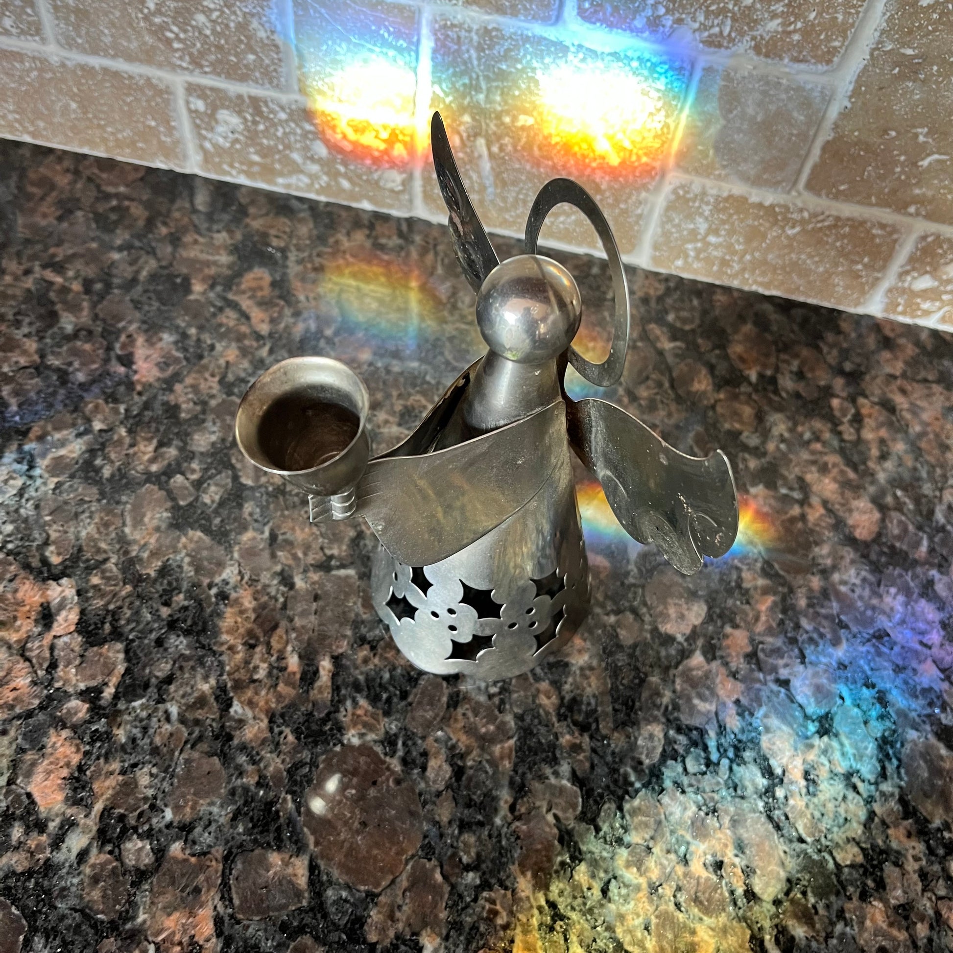 Vintage Metal Angel Candle holder / Tree Topper. Very good used condition, candleholder / bell is a little loose, shows a little wear to finish, see photos for details. Measures approx. 7" tall, 5.5" x 4".