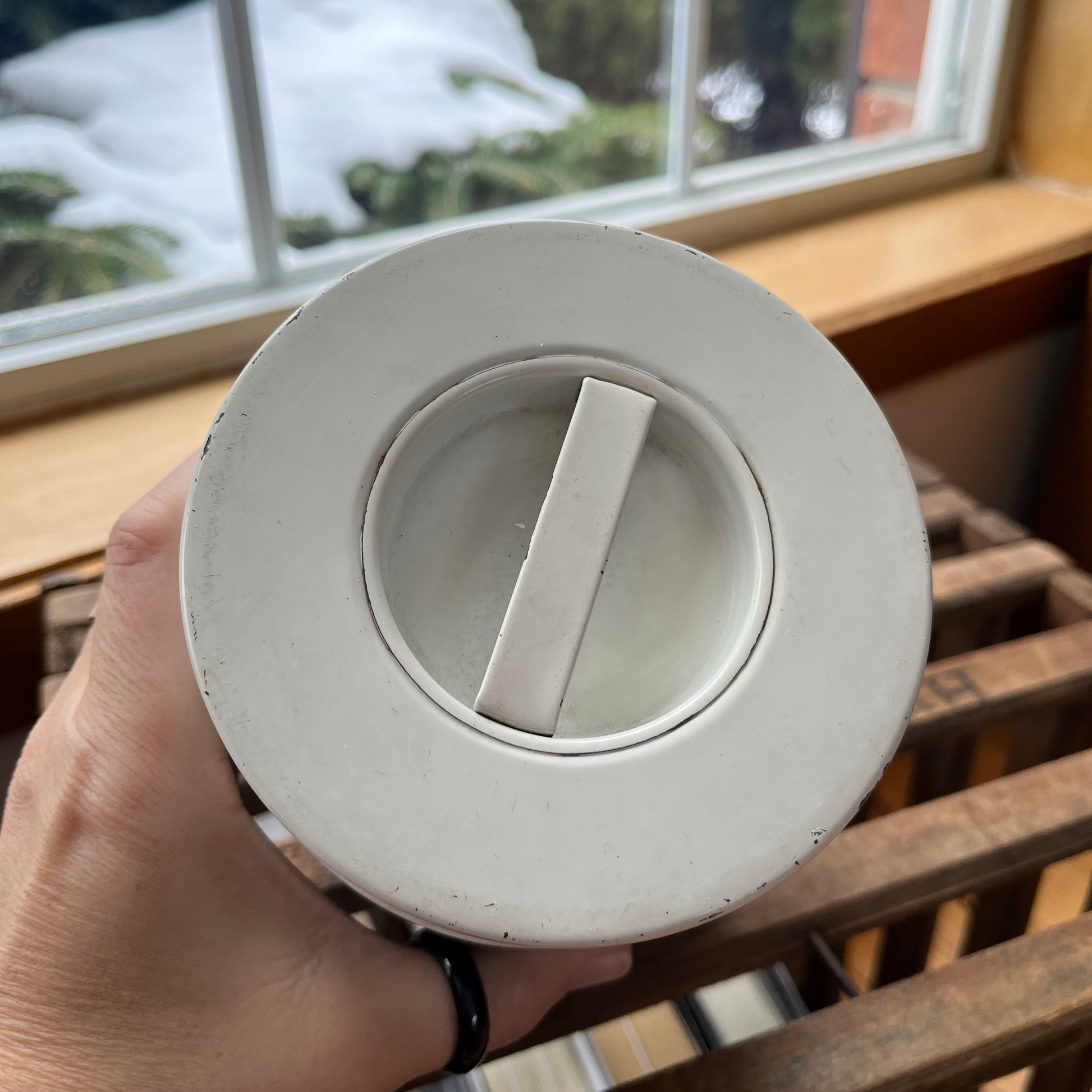 Vintage Mid Century Modern Black and White Graphic Tin Canister. Lovely vintage piece! Shows some light wear, see photos for details. Measures approx. 5.5" tall, 4.5" wide.