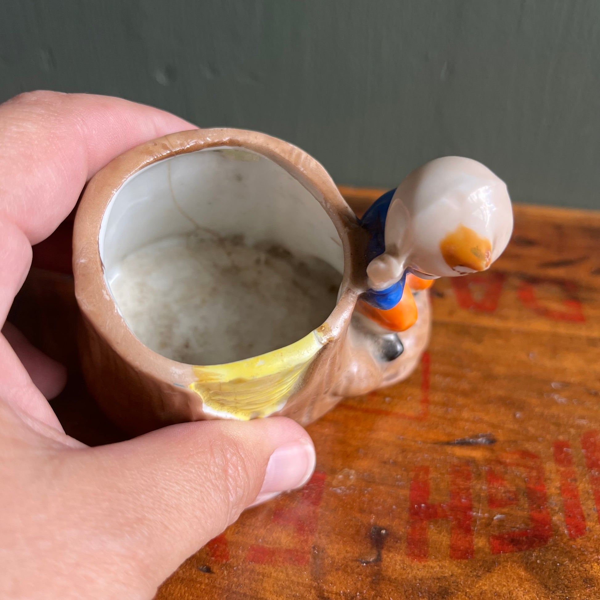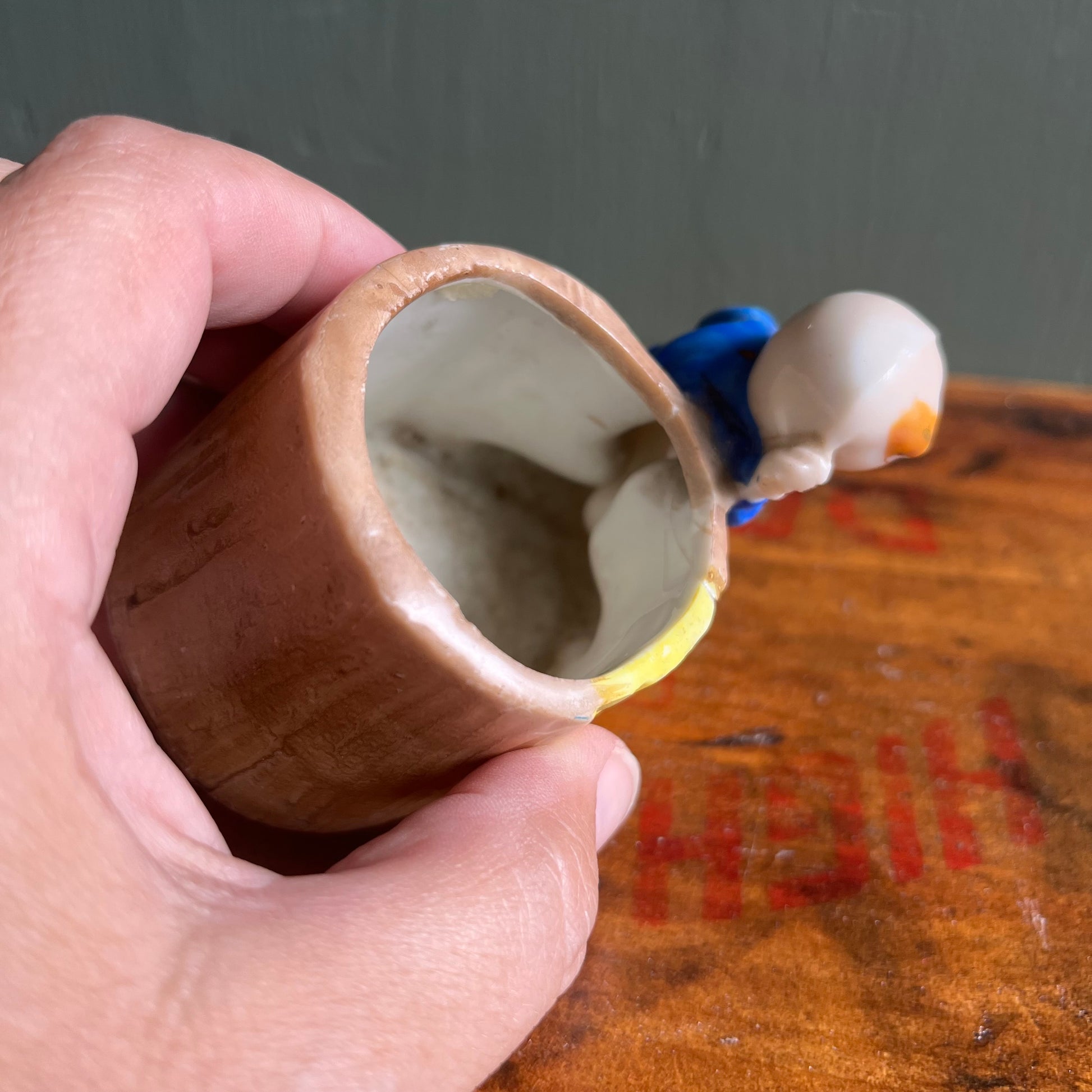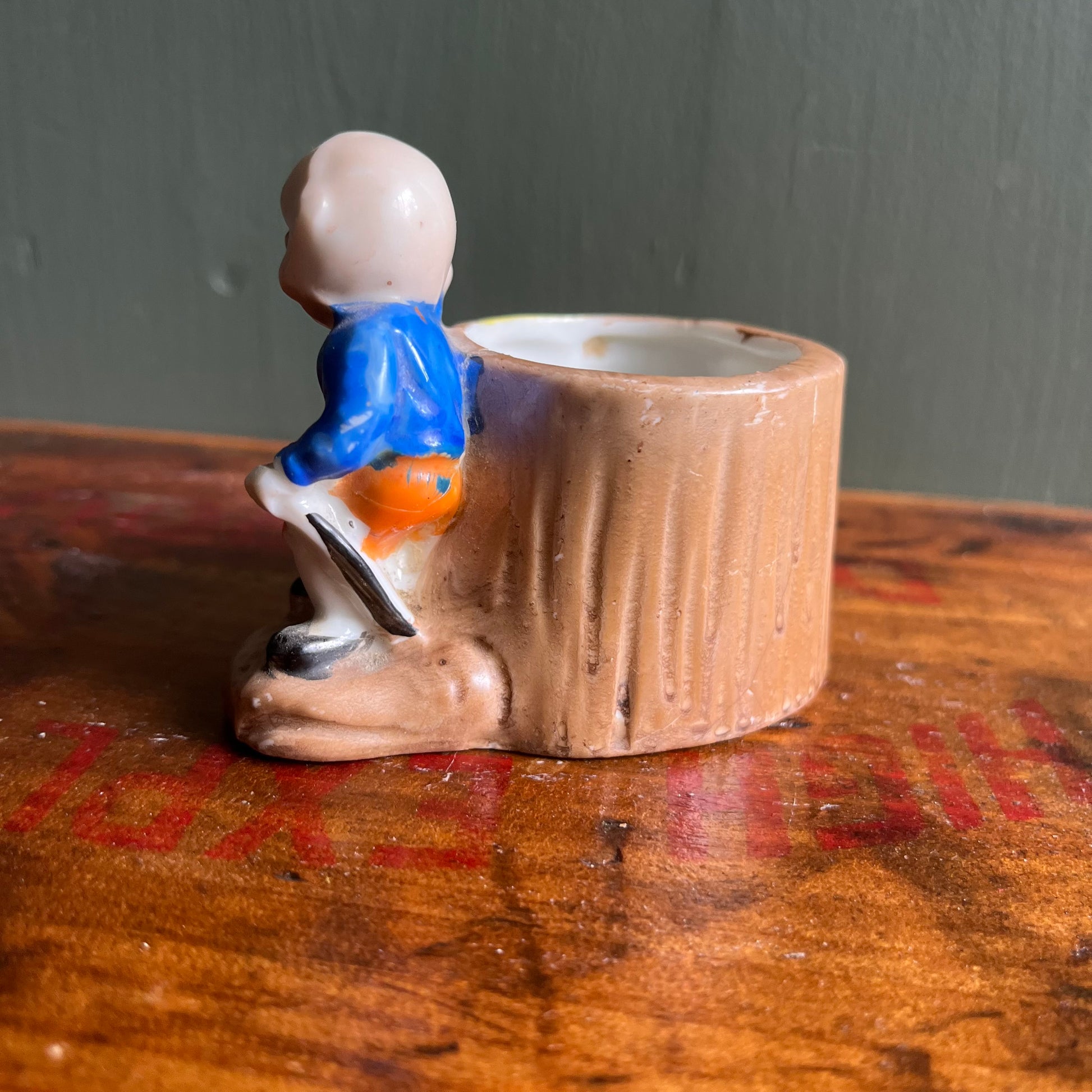 Vintage mini red headed boy with tree stump planter / vessel / holder. Made in Japan, stamped on bottom. Good used condition, does show a crack, see photos for details on wear. Measures approx. 2.75" x 3.75" x 2".