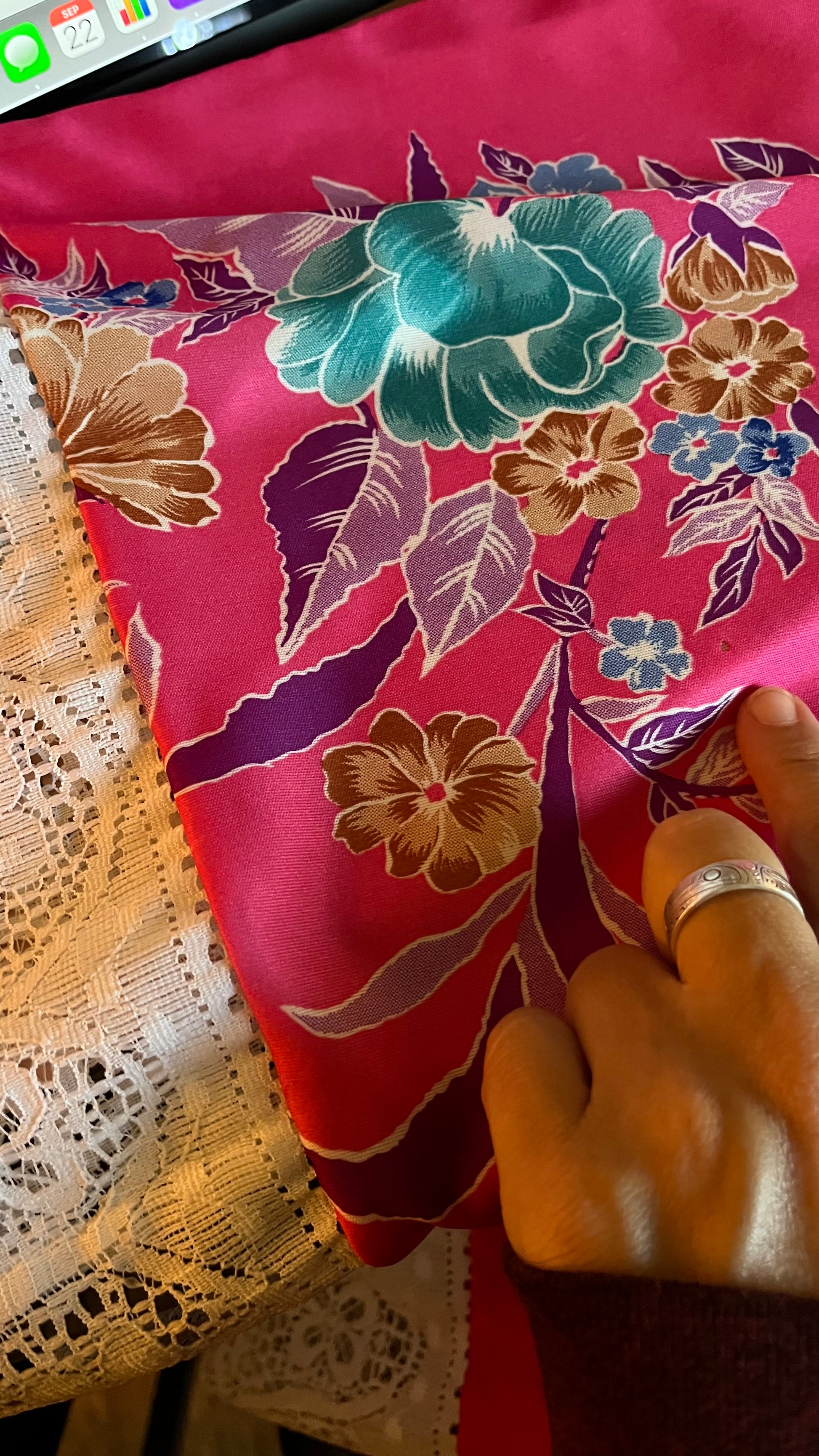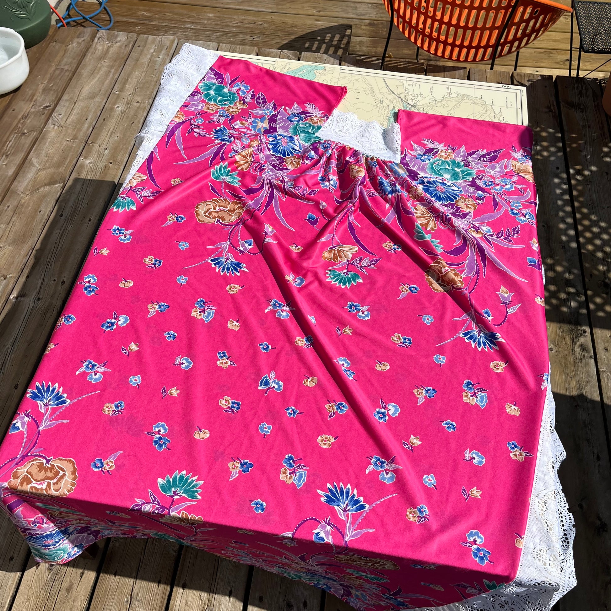 Vintage 80s / 90s pink floral prink lace trimmed house dress muumuu. No tags indicating maker, material or size. I would say it's an acrylic, fits as a large or bigger. Does have one small (burn?) mark. Measures 31" across shoulders (not including lace), 31" pit to pit, 30" wide hips, 26.5" wide at base, 54" long.