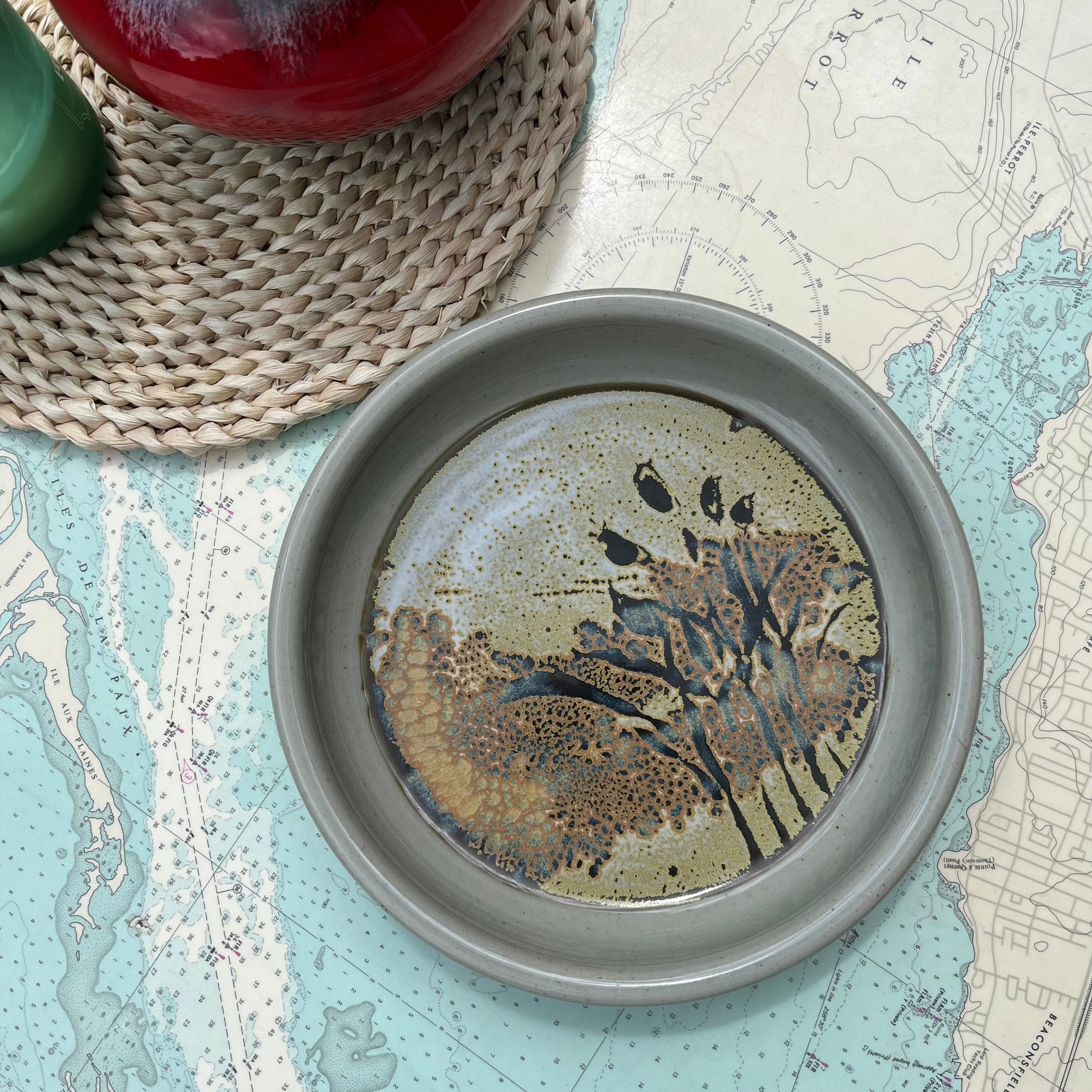 Vintage Reddick hand thrown ceramic pottery platter / plate / shallow dish. Made by Prince Edward County Artist Bill Reddick. Lovely impressionistic cattail style pattern. No chips or cracks, measures approximately 9.25" wide, 2" tall.