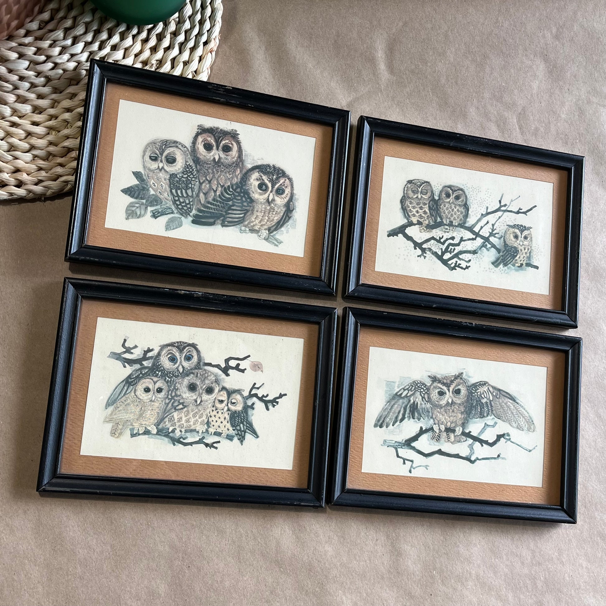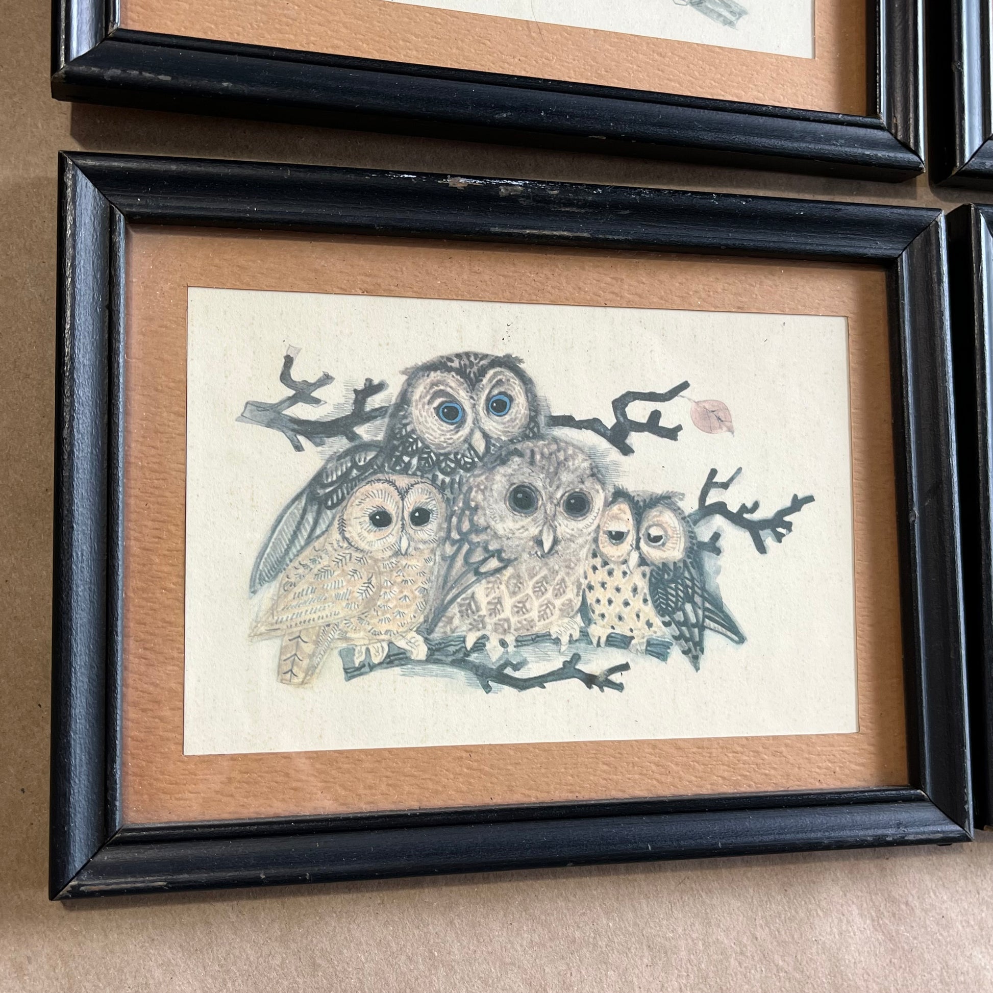 Vintage Set of Four Owl Family Framed Prints