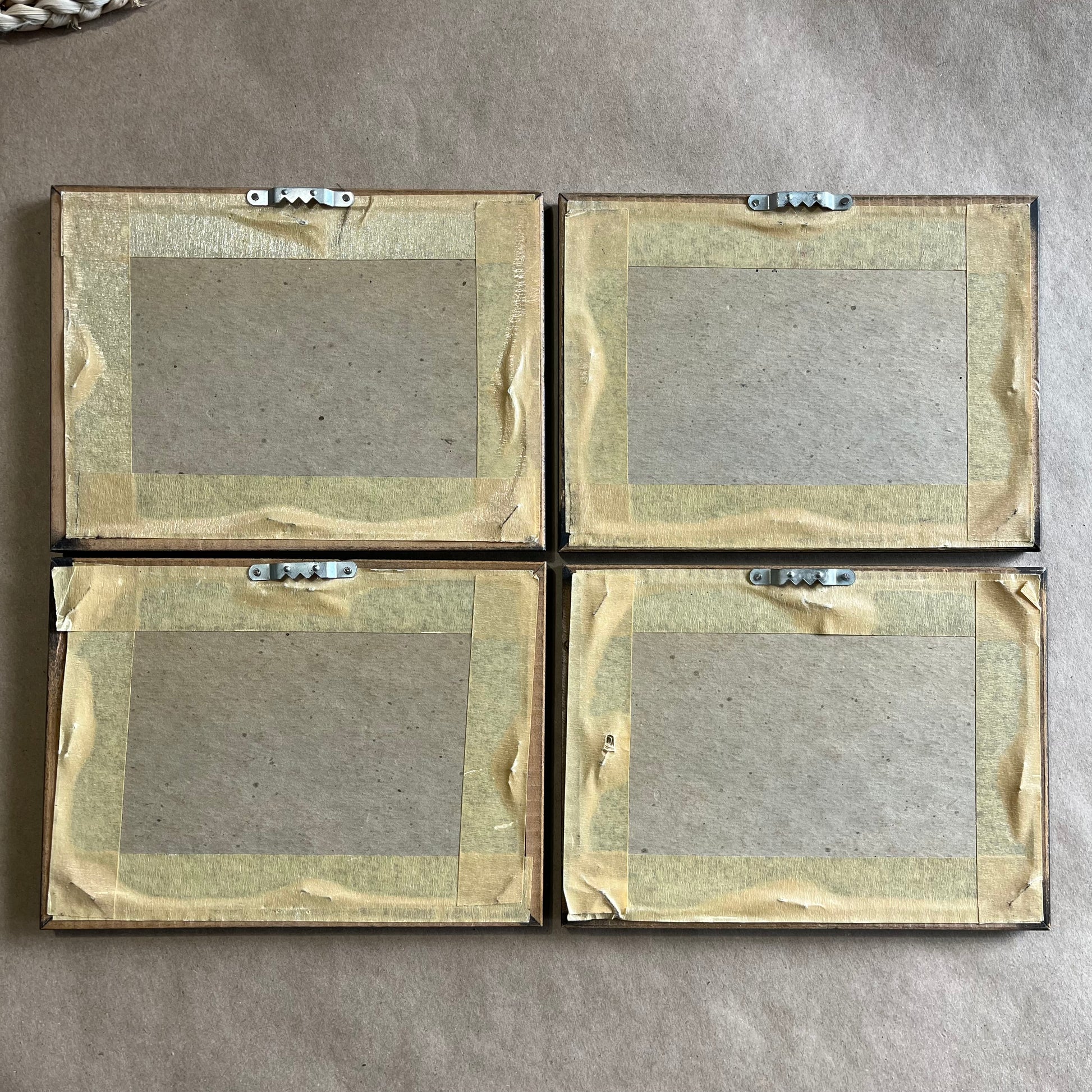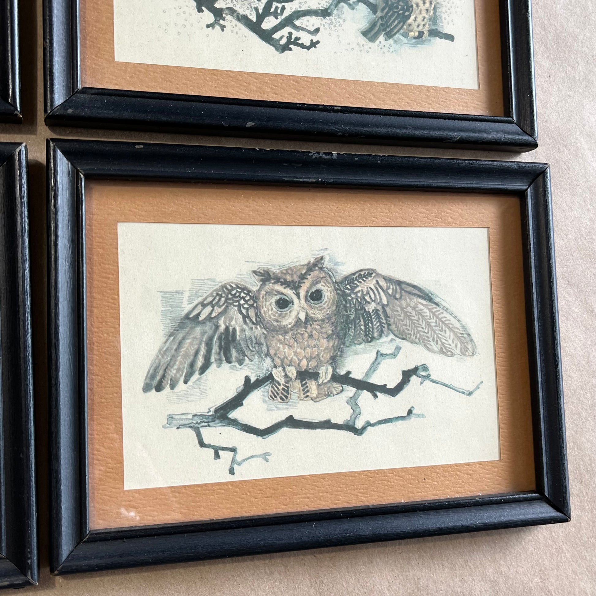 Vintage set of four owl family framed prints. Wonderful mini gallery of prints with orange/brown matting. No indication of maker. Each frame shows some light wear, see photos for details. Each piece measures 7.75" x 5.75".