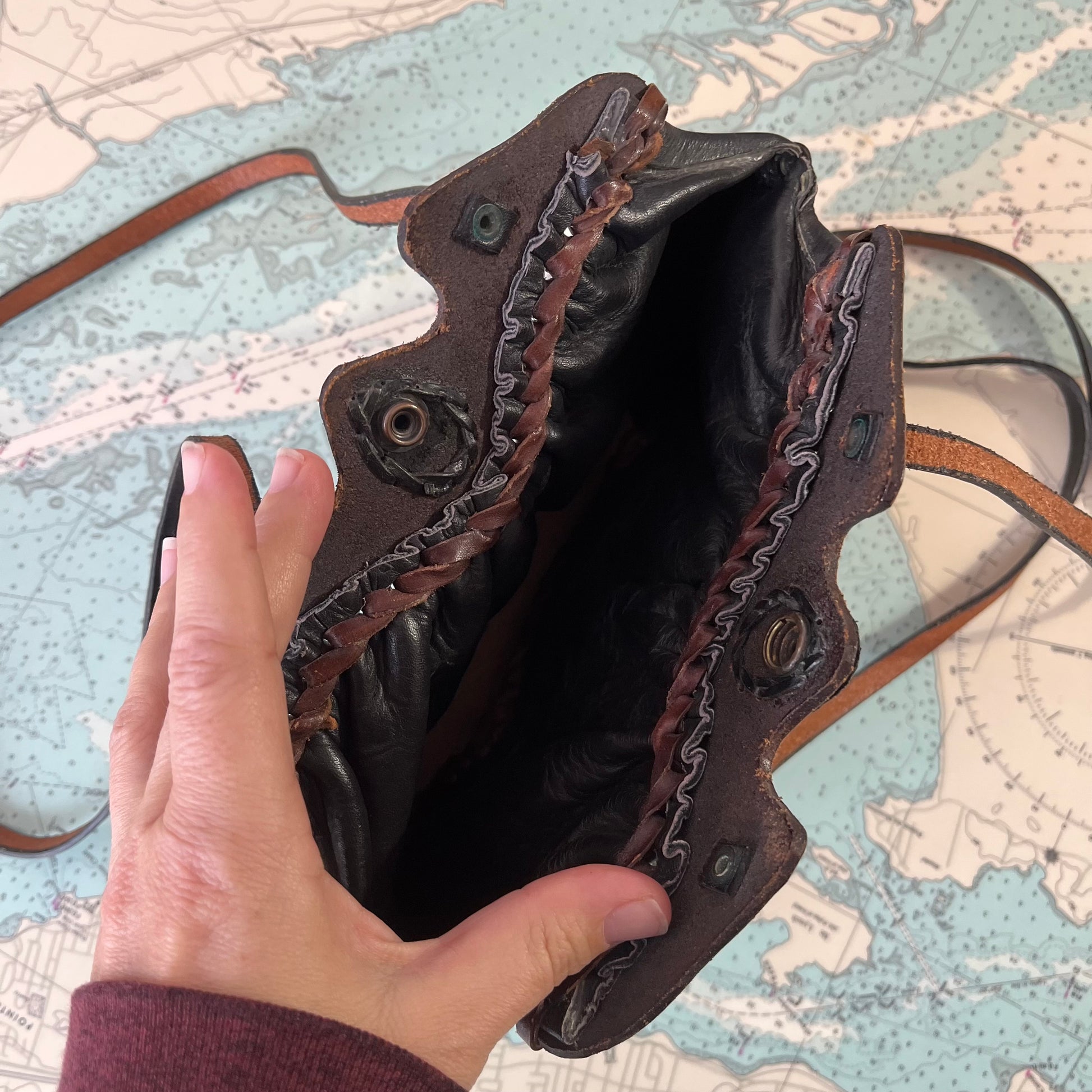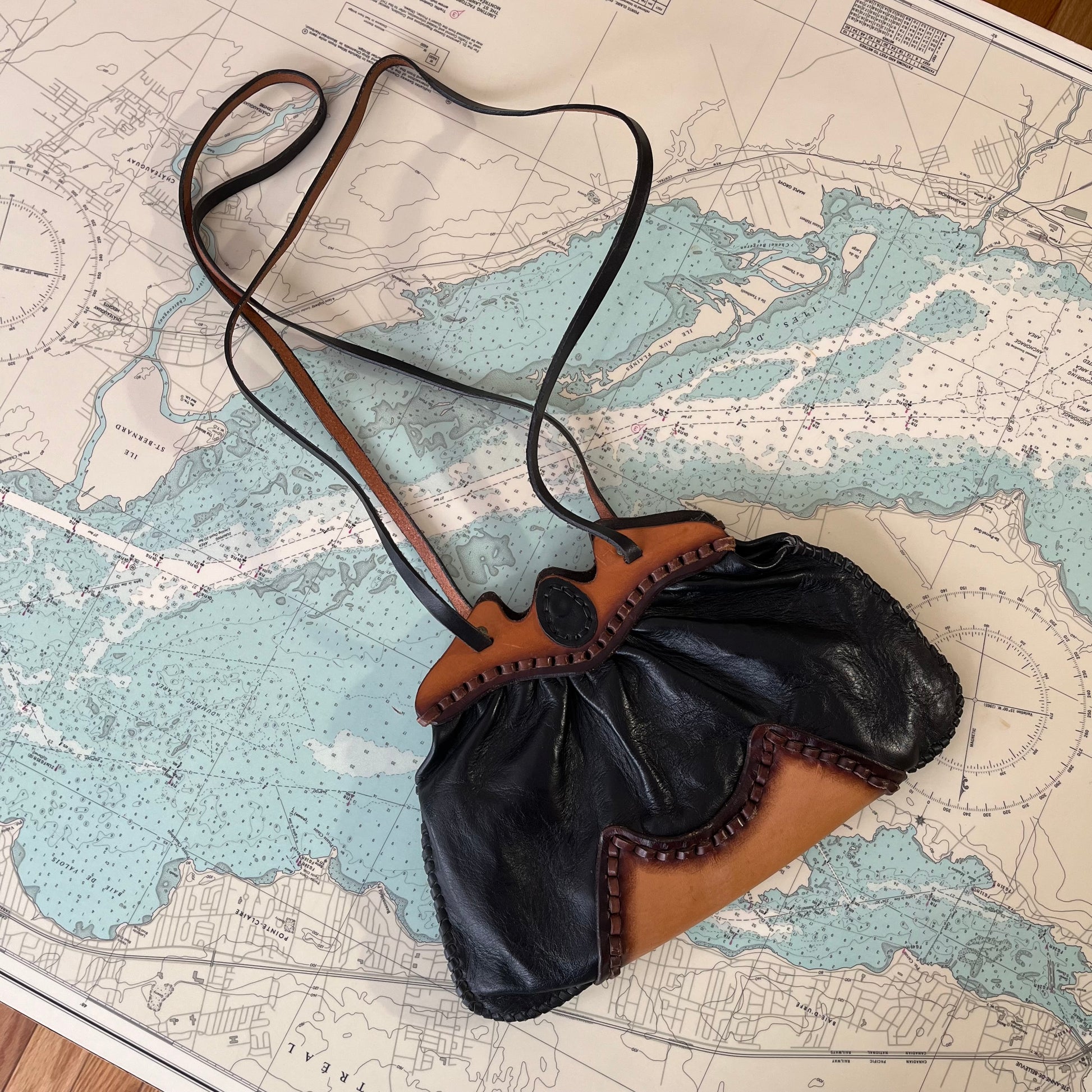 Vintage Tooled Leather Two-Tone Purse. Very good used condition, see photos for details. Bag itself measures approximately 7.75" across mouth, 12" wide body, 8" tall.